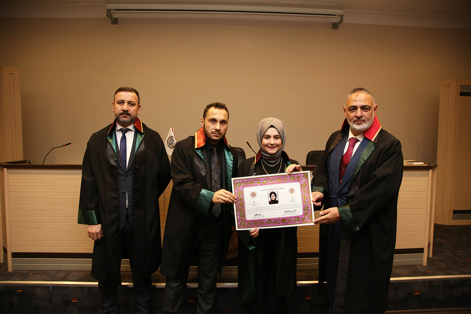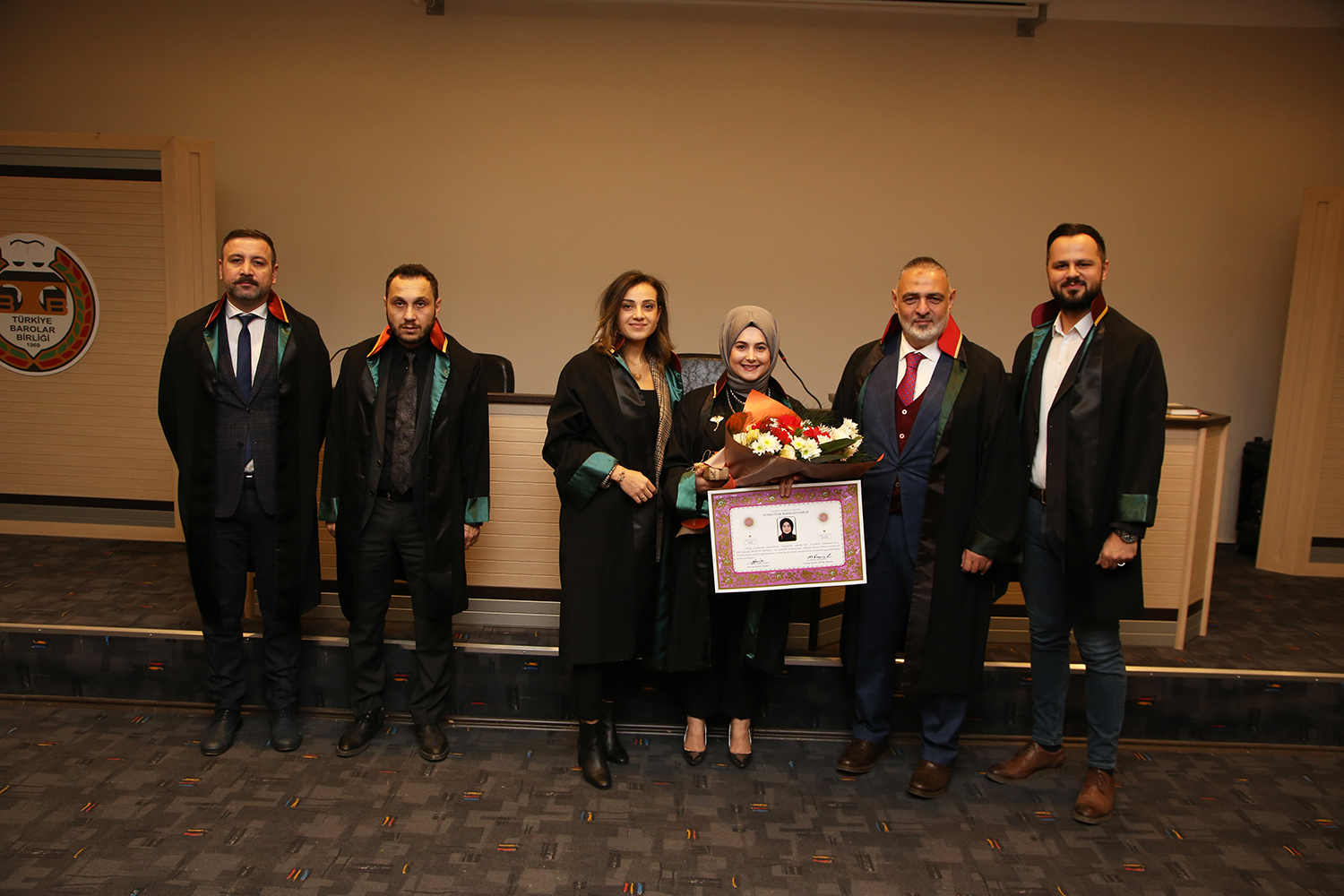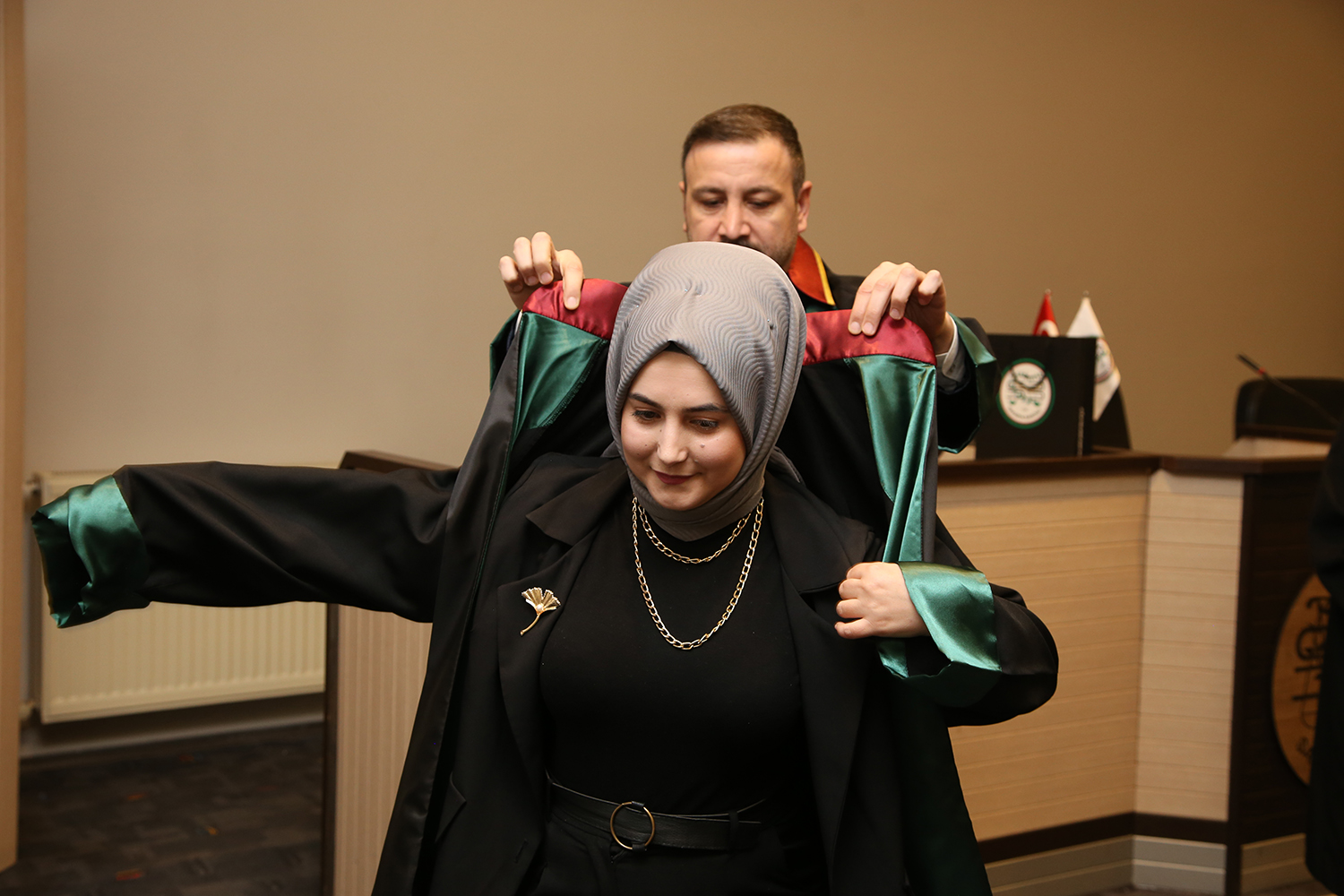 Staj dönemini başarıyla tamamlayan stajyer avukat Mehtap Aktaş, meslek yemininin ardından cübbesini giyerek ruhsatnamesini aldı.