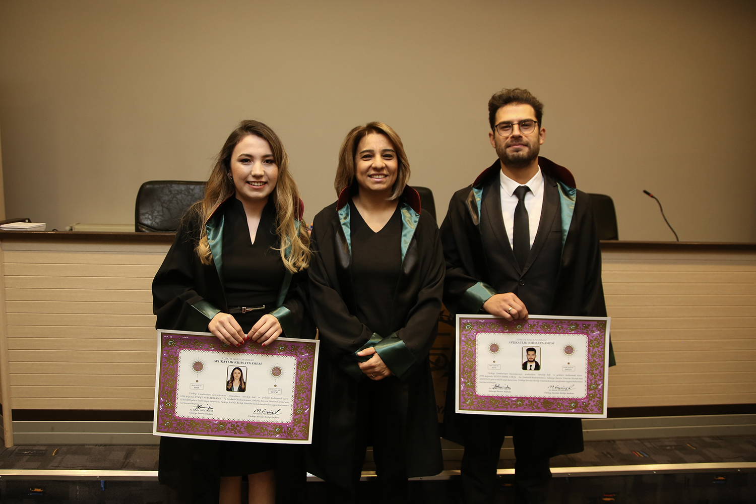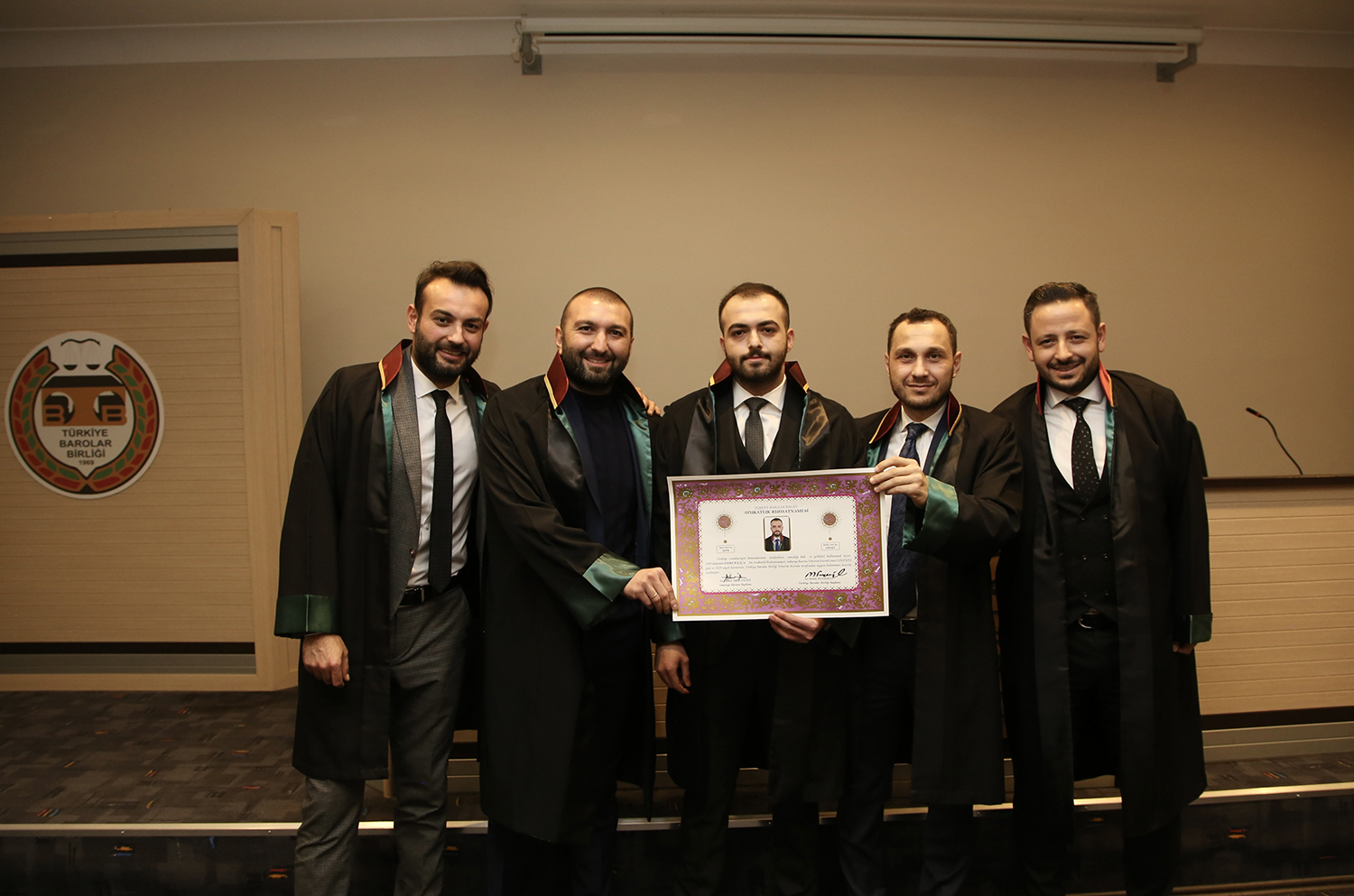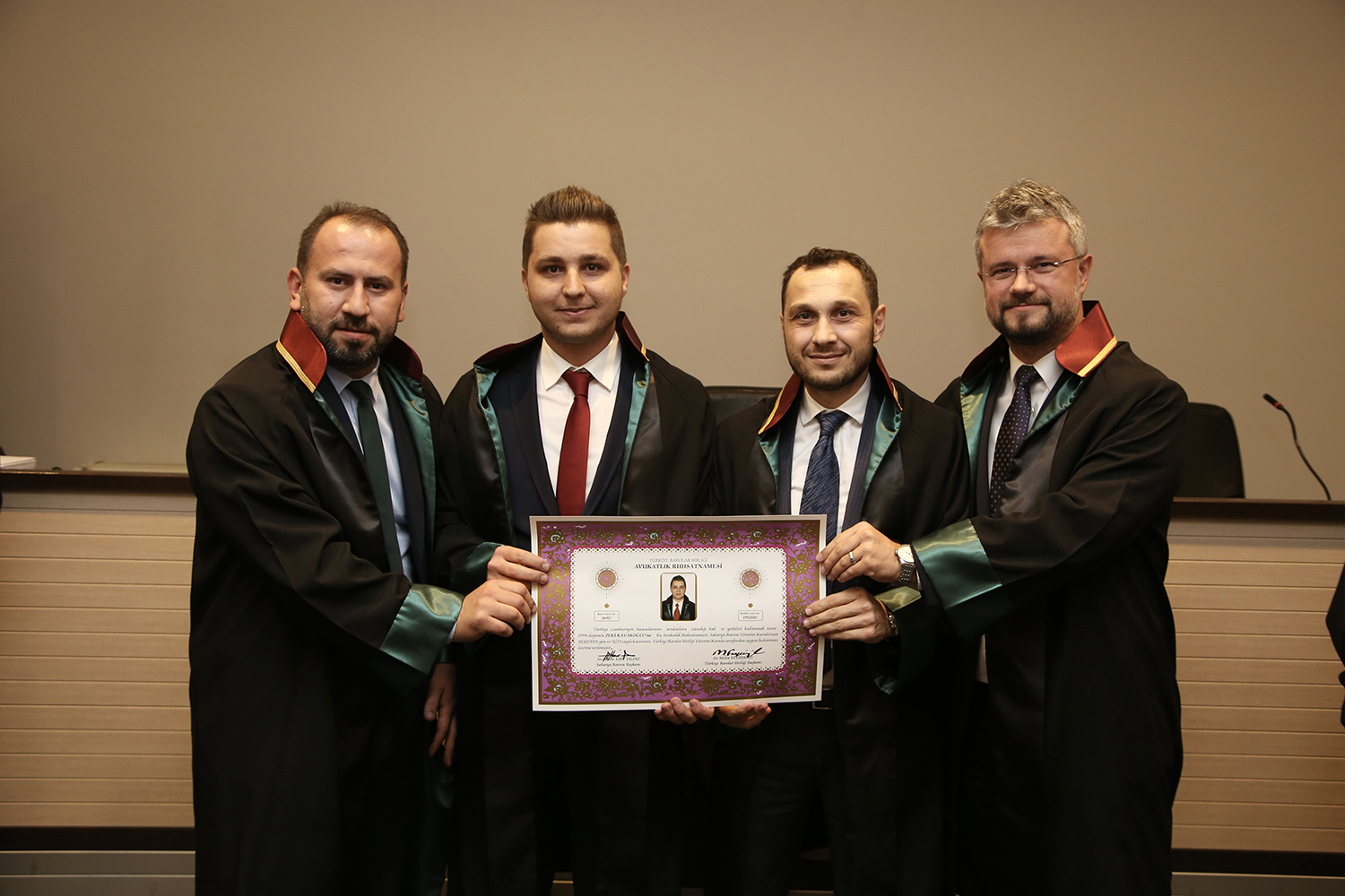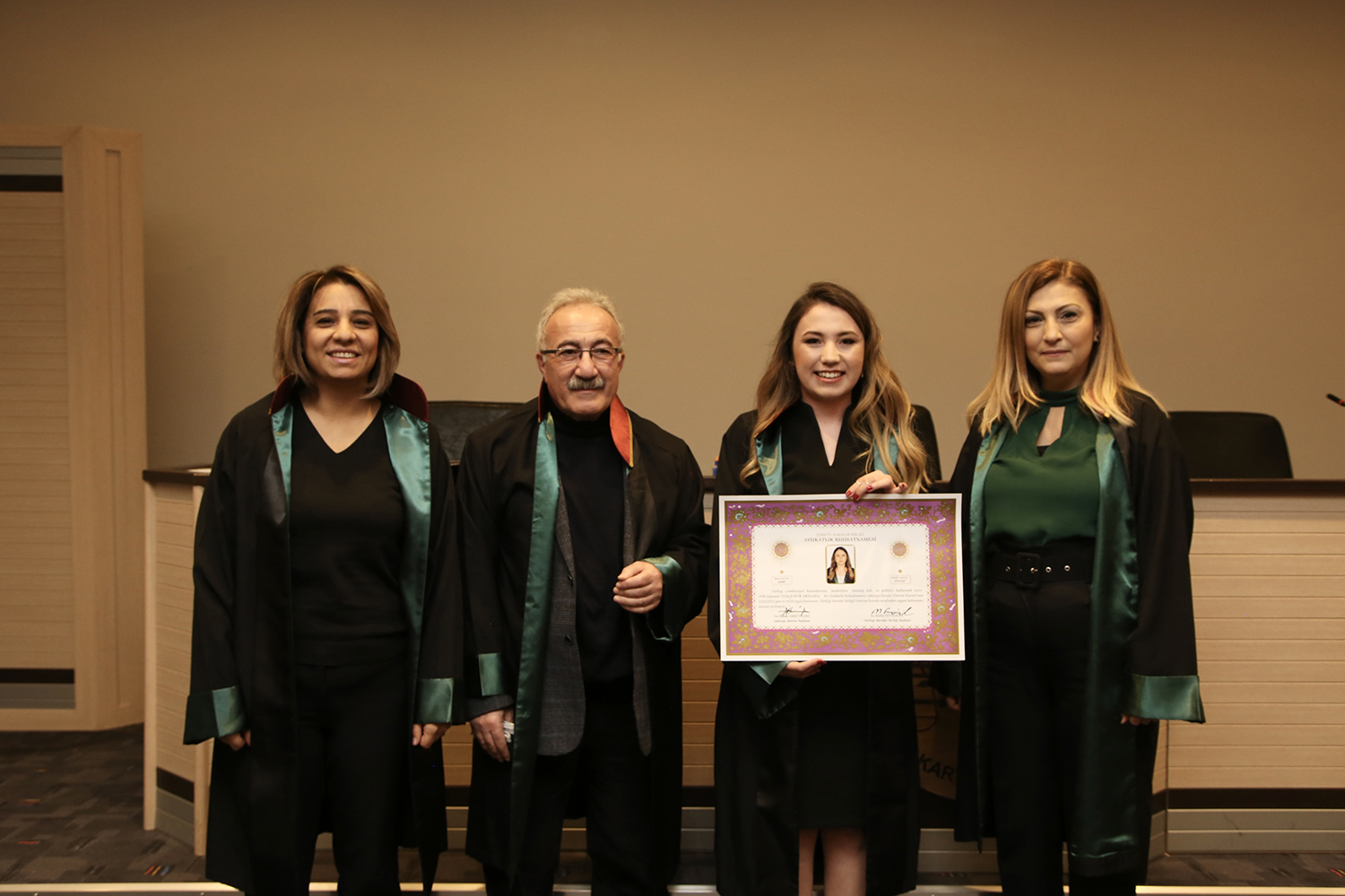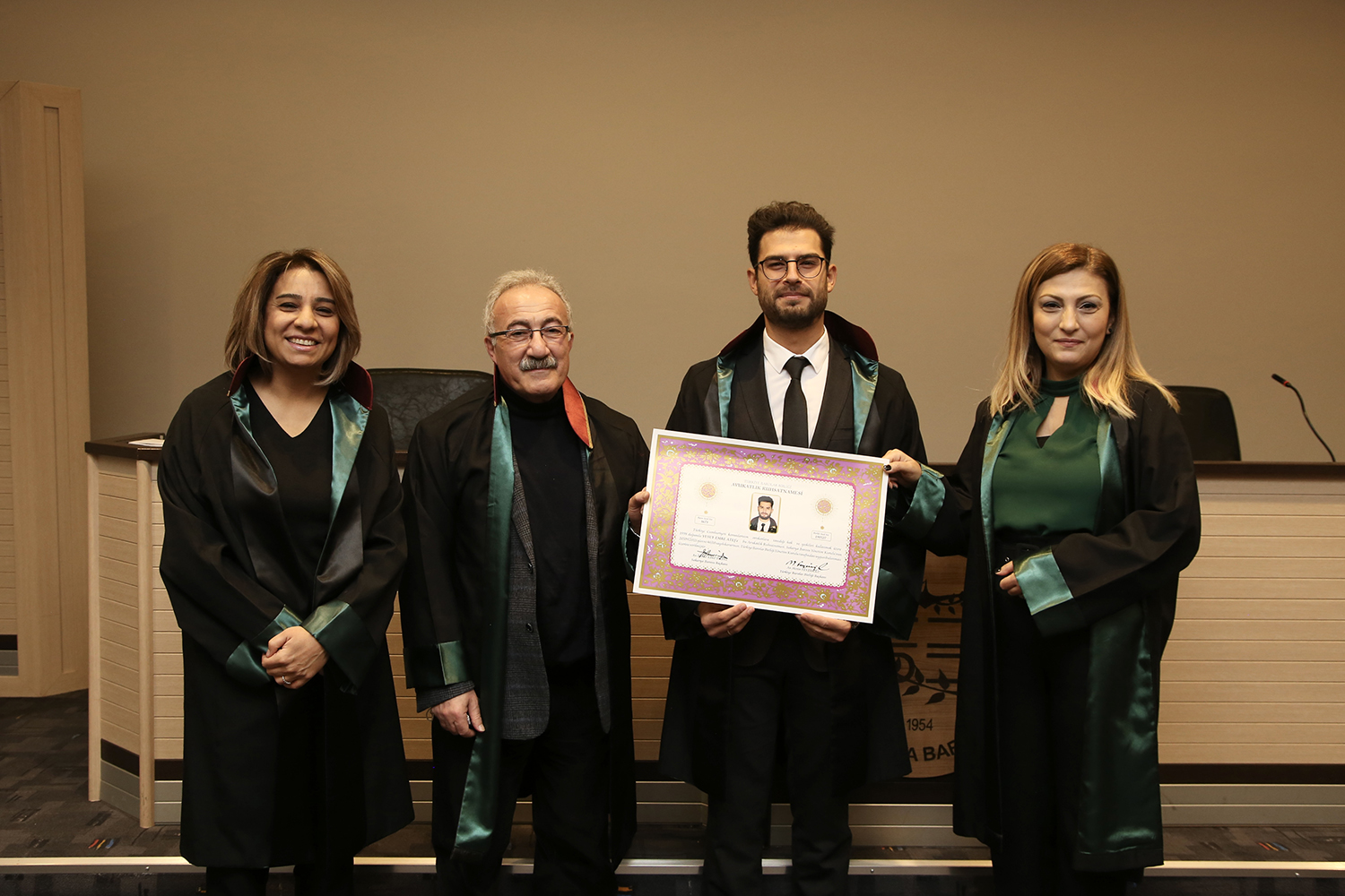 Staj dönemini başarıyla tamamlayan stajyer avukatlar; Tuğçe Nur Arslan, Yusuf Emre Ateş, Emre Kılıç ve Zeki Kavakoğlu meslek yeminlerini edip cübbelerini giyerek ruhsatnamelerini aldılar.