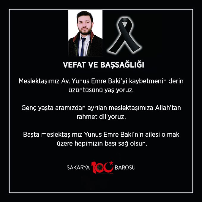 Meslektaşımız Av. Yunus Emre Baki’yi kaybetmenin derin üzüntüsünü yaşıyoruz. Genç yaşta aramızdan ayrılan meslektaşımıza Allah’tan rahmet diliyoruz. Başta meslektaşımız Yunus Emre Baki’nin ailesi olmak üzere hepimizin başı sağ olsun.