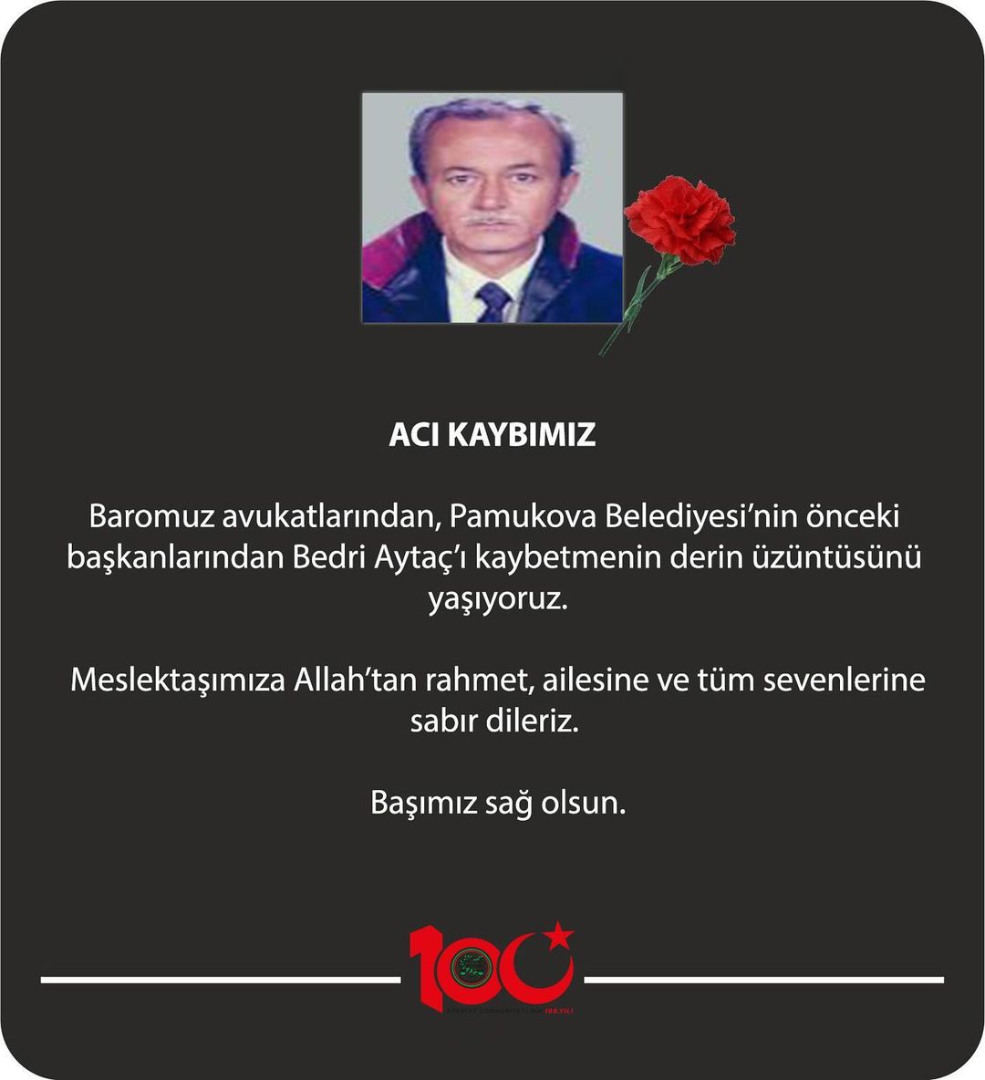 Baromuz avukatlarından, Pamukova Belediyesi’nin önceki başkanlarından Bedri Aytaç’ı kaybetmenin derin üzüntüsünü yaşıyoruz.