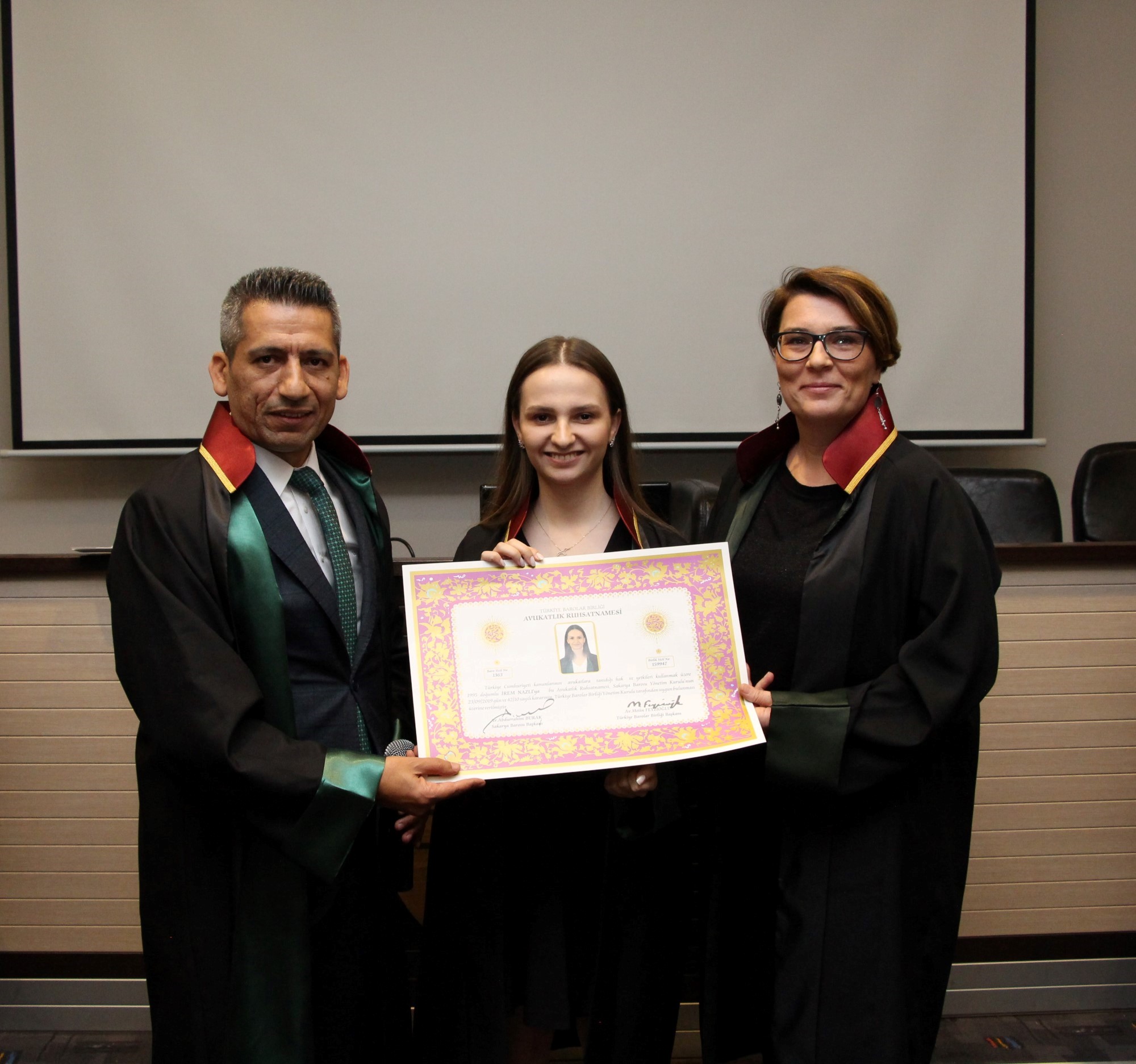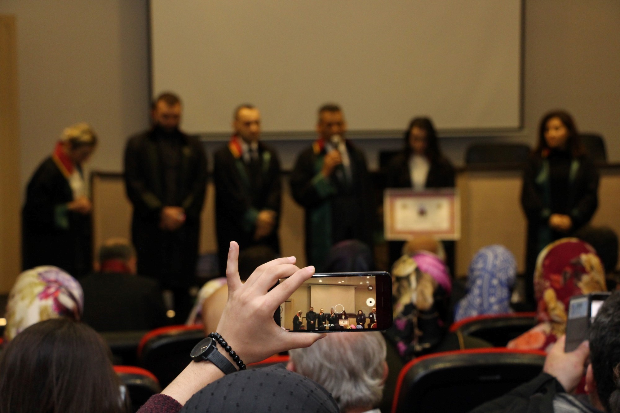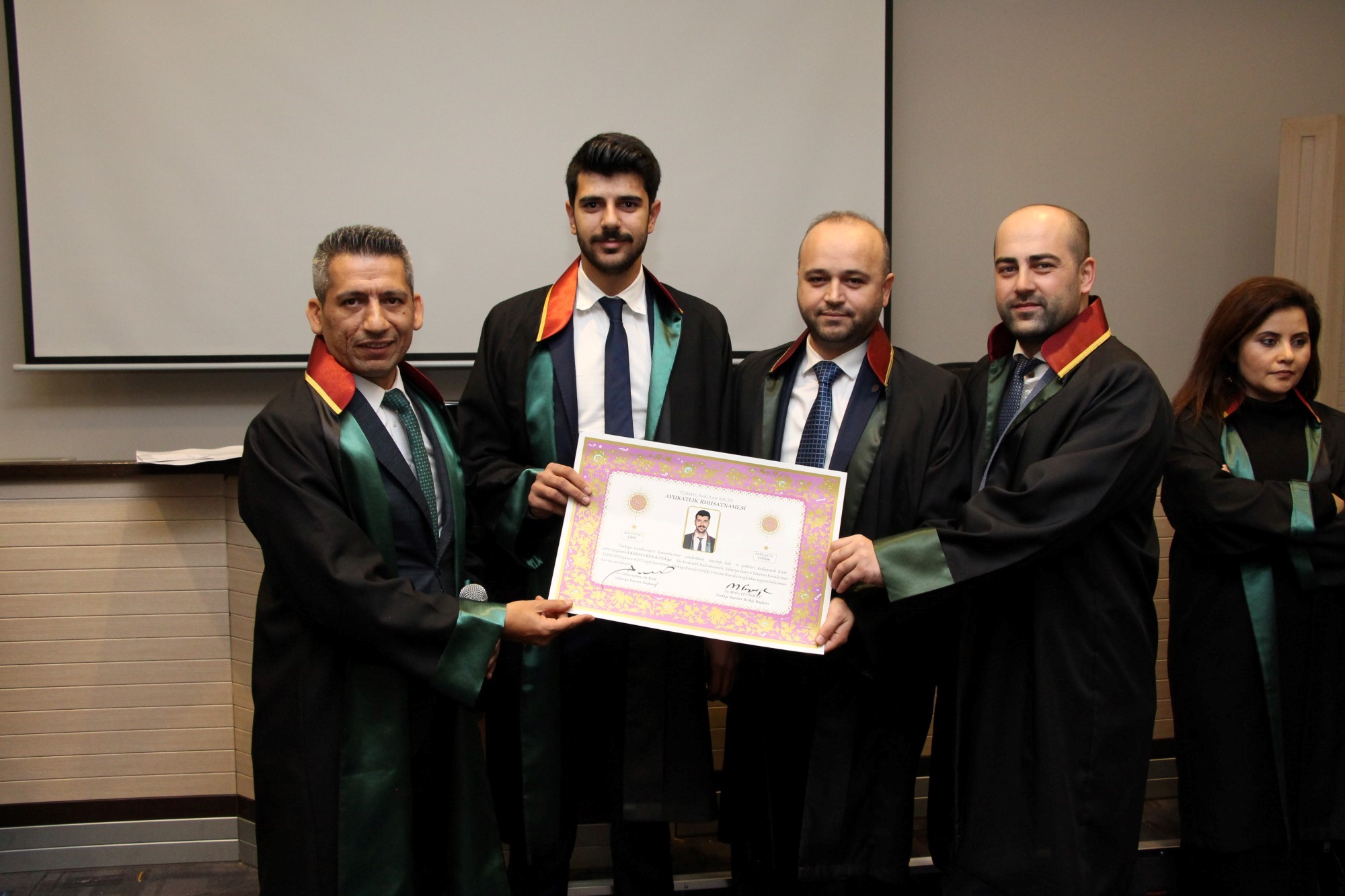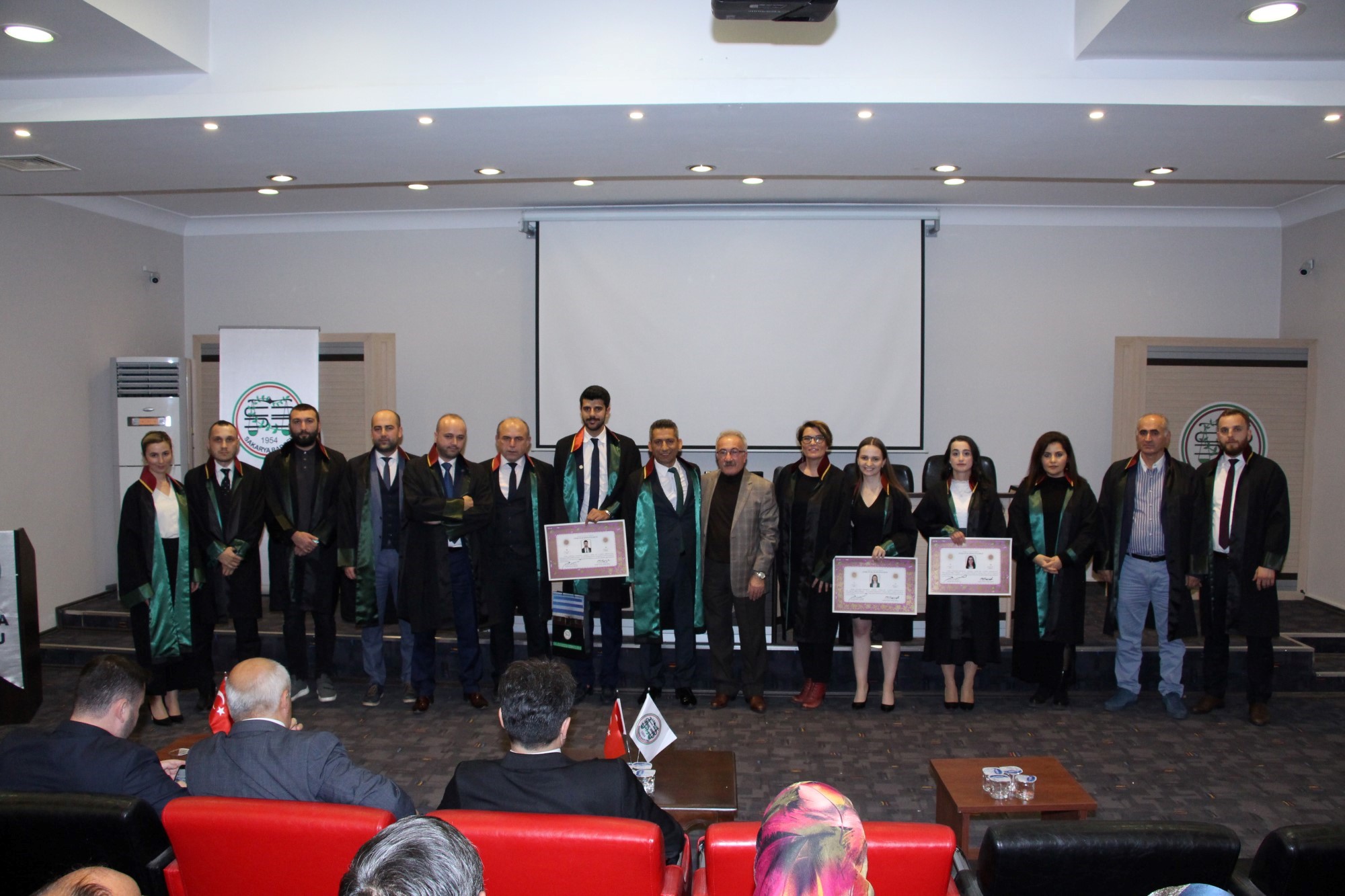 Staj dönemini başarıyla tamamlayan stajyer avukatlar; Sibel Yağcı, İrem Nazlı ve Ekrem Eren Kaya, meslek yeminlerinin ardından cübbelerini giyerek ruhsatnamelerini aldı.