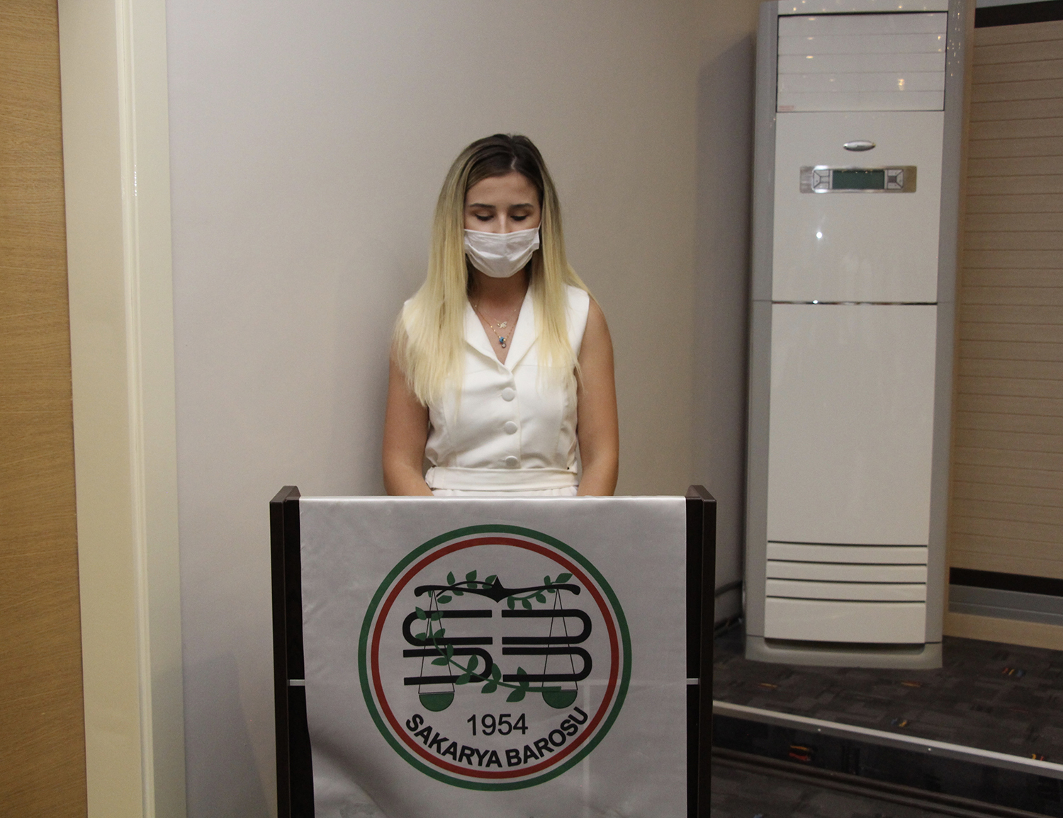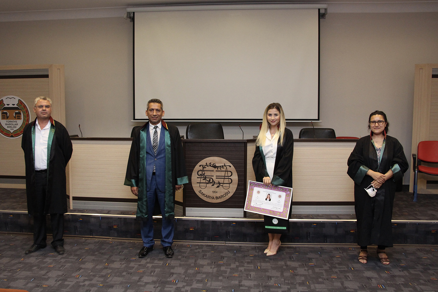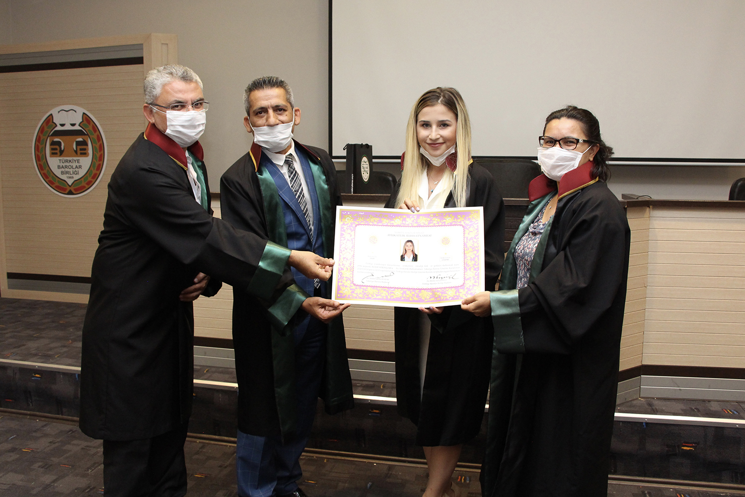 Staj dönemini başarıyla tamamlayan stajyer avukat Ecem Yeralçak, meslek yemininin ardından cübbesini giyerek ruhsatnamesini aldı.