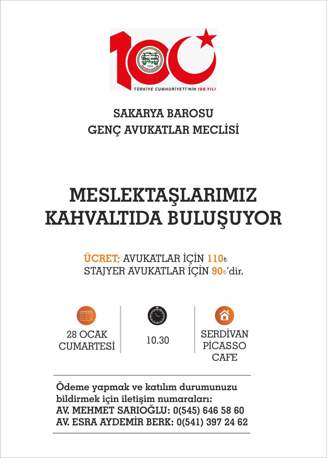 Genç Avukatlar Meclisimiz tarafından 28 Ocak Cumartesi, saat 10.30’da Serdivan Picasso Cafe'de düzenlenecek kahvaltı programına tüm meslektaşlarımızı ve stajyerlerimizi bekliyoruz.