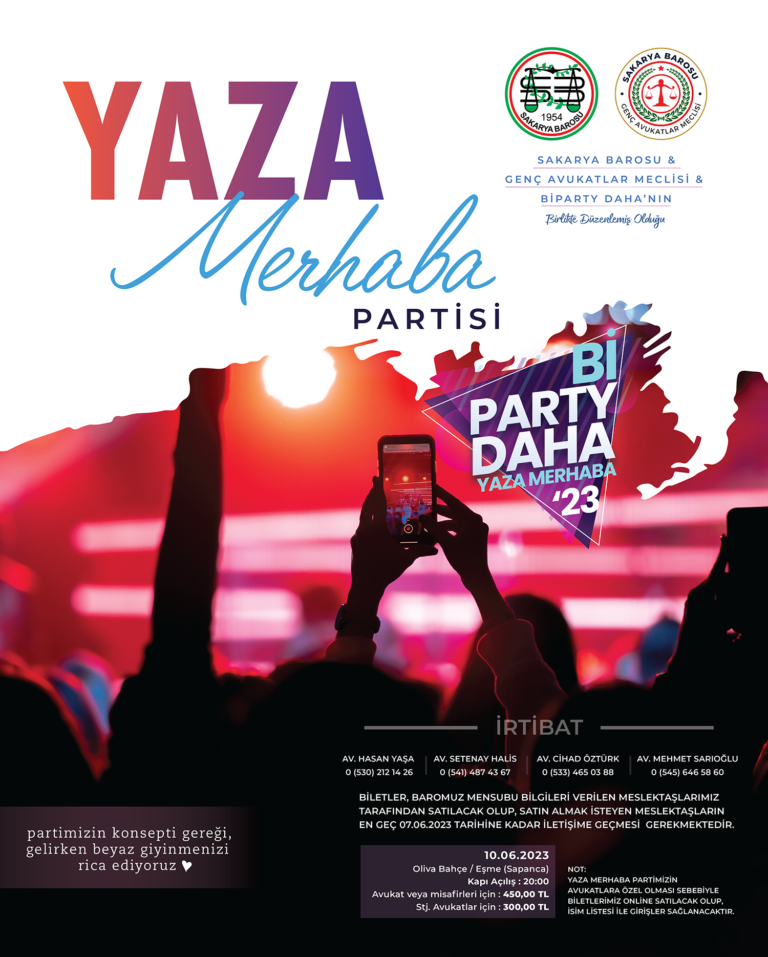 10 Haziran Cumartesi, saat 20.00’de, Sapanca Oliva Bahçe’de düzenleyeceğimiz Yaza Merhaba Partimize, tüm meslektaşlarımızı ve stajyerlerimizi bekliyoruz.
