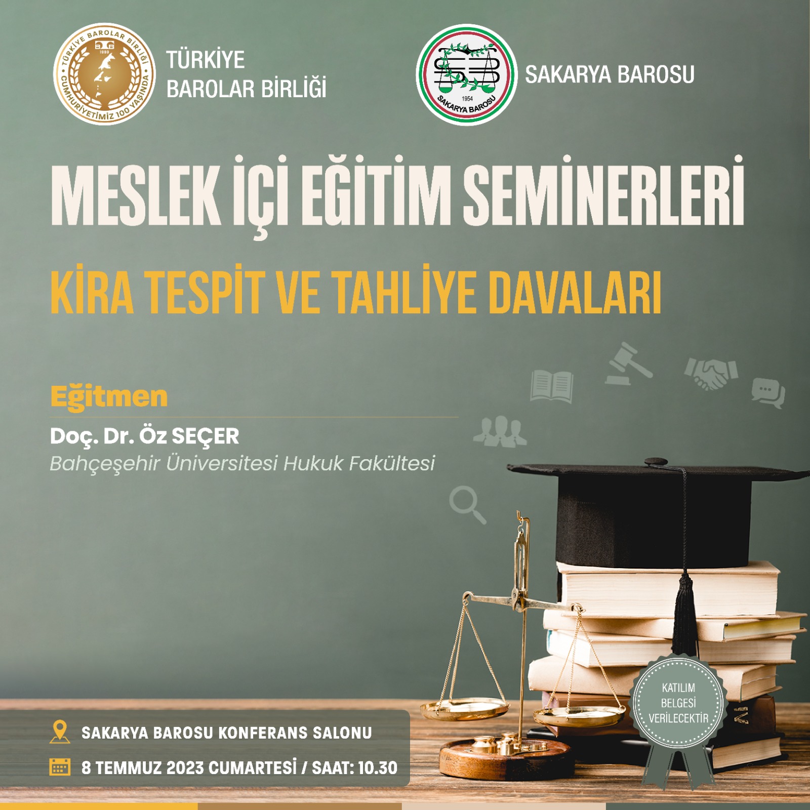 Baromuz ve TBB iş birliğiyle 8 Temmuz Cumartesi günü, saat 10.30’da Konferans Salonumuzda ‘Kira Tespit ve Tahliye Davaları’ konulu seminer düzenlenecektir. Seminer, Bahçeşehir Üniversitesi Hukuk Fakültesi'nden Doç. Dr. Öz Seçer tarafından verilecektir. Tüm meslektaşlarımız ve stajyerlerimiz seminere davetlidir. Seminer sonunda sertifika da verilecektir.