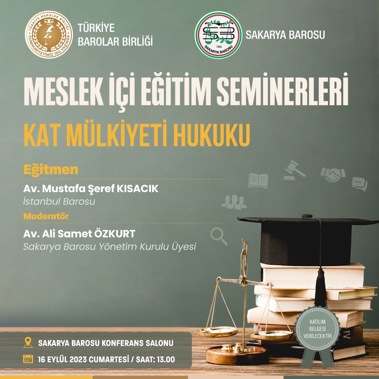 Baromuz ve TBB iş birliğiyle 16 Eylül Cumartesi, saat 13.00'de Konferans Salonumuzda "Kat Mülkiyeti Hukuku" konulu seminer düzenlenecektir. Seminer, İstanbul Barosu üyesi meslektaşımız Av. Mustafa Şeref Kısacık tarafından verilecektir. Tüm meslektaşlarımız ve stajyerlerimiz seminere davetlidir. Seminere katılanlara sertifika da verilecektir. Bilgilerinize sunarız.