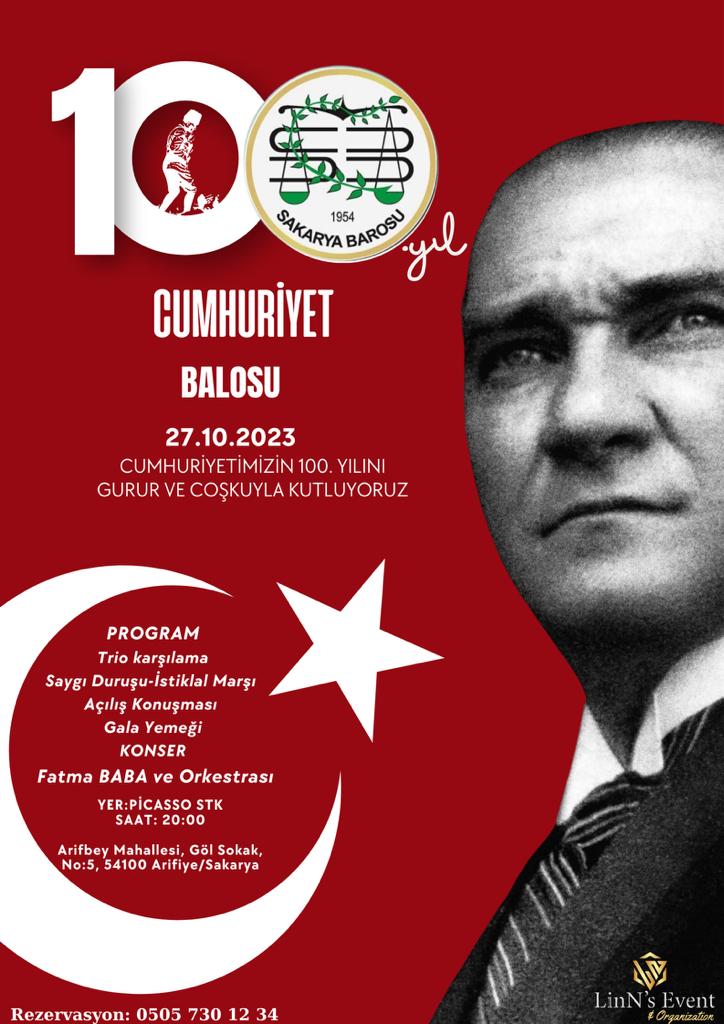 Cumhuriyetimizin 100. yıl dönümü nedeniyle Baromuz tarafından 27 Ekim Cuma, saat 20.00’de, Arifiye Picasso STK’da Cumhuriyet Balosu düzenlenecektir. Baloya katılım için alınacak bilet ücreti stajyerlerimiz için 350 TL, meslektaşlarımız için 700 TL olarak belirlenmiştir. Biletlerinizi, Yazı İşleri Müdürlüğümüz, Sakarya Adliyesi Baro Odamız ya da aşağıdaki iletişim numaralarını arayarak alabileceğinizi bilgilerinize sunarız.