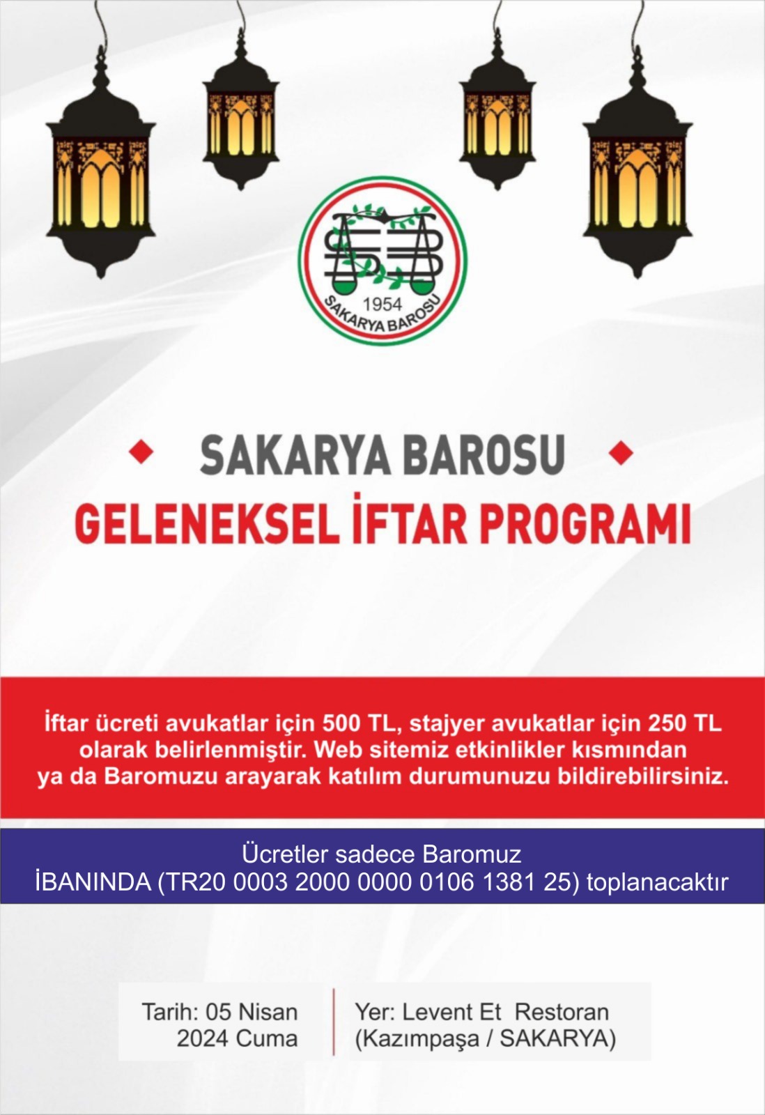 Baromuz tarafından 5 Nisan Cuma günü Levent Et Restoranda iftar programı düzenlenecektir. İftar ücreti avukatlar için 500 TL, stajyer avukatlar için 250 TL olarak belirlenmiştir. Ücretler sadece Baromuza ait İBAN numarasında (TR20 0003 2000 0000 0106 1381 25- İBAN SAHİBİ: SAKARYA BAROSU BAŞKANLIĞI) toplanacaktır. Kişi sayısına göre restorandan yer ayırtılacağı için katılım durumunuzu aşağıda yer alan bağlantıdaki formu doldurarak ya da Baromuzu arayarak 30 Mart Cumartesi tarihine kadar bildirmenizi rica ediyoruz. Bilgilerinize sunarız.