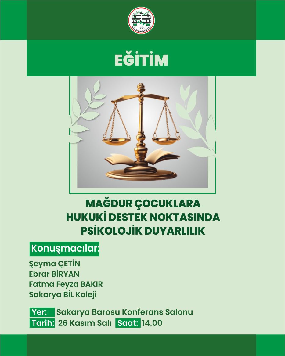 Mağdur Çocuklara Hukuki Destek Noktasında Psikolojik Duyarlılık konulu eğitim 26.11.2024 14:00 Sakarya Barosu Konferans Salonu 262 Görüntüleme