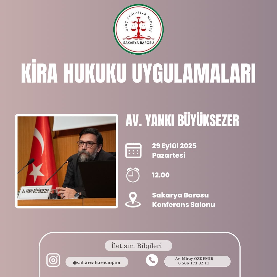 Kira Hukuku Uygulamaları konulu eğitim 29.09.2025 12:00 Sakarya Barosu Konferans Salonu 278 Görüntüleme