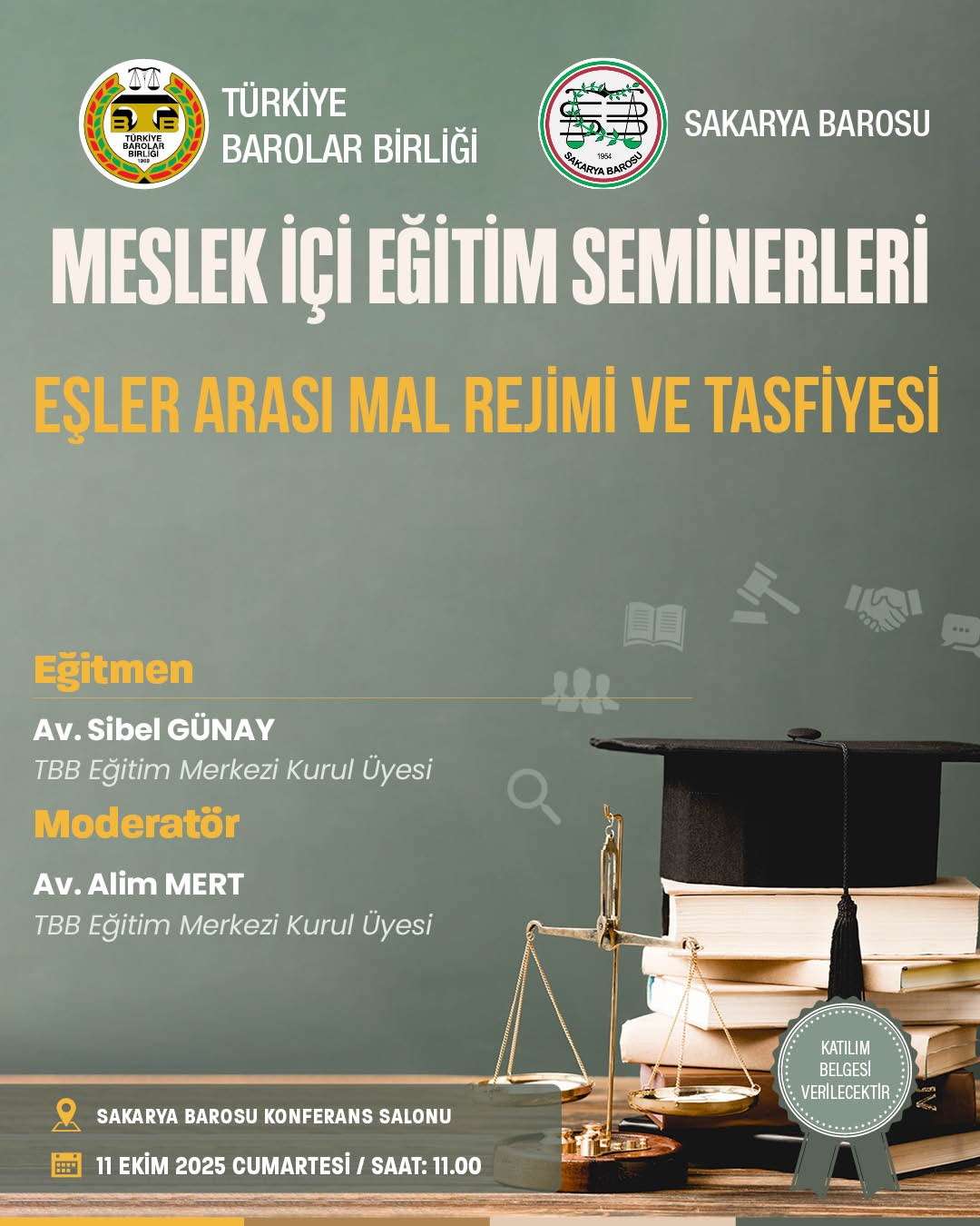 Eşler Arası Mal Rejimi ve Tasfiyesi konulu seminer 11.10.2025 11:00 Sakarya Barosu Konferans Salonu 591 Görüntüleme