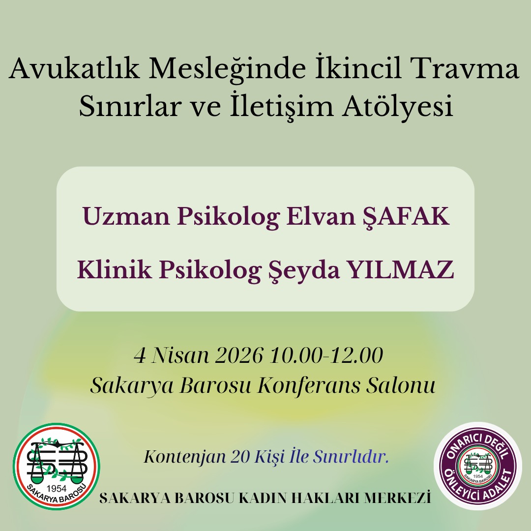 Değerli Meslektaşlarımız, Kadın Hakları Merkezimiz tarafından “Avukatlık Mesleğinde İkincil Travma Sınırlar ve İletişim Atölyesi” düzenlenecektir.