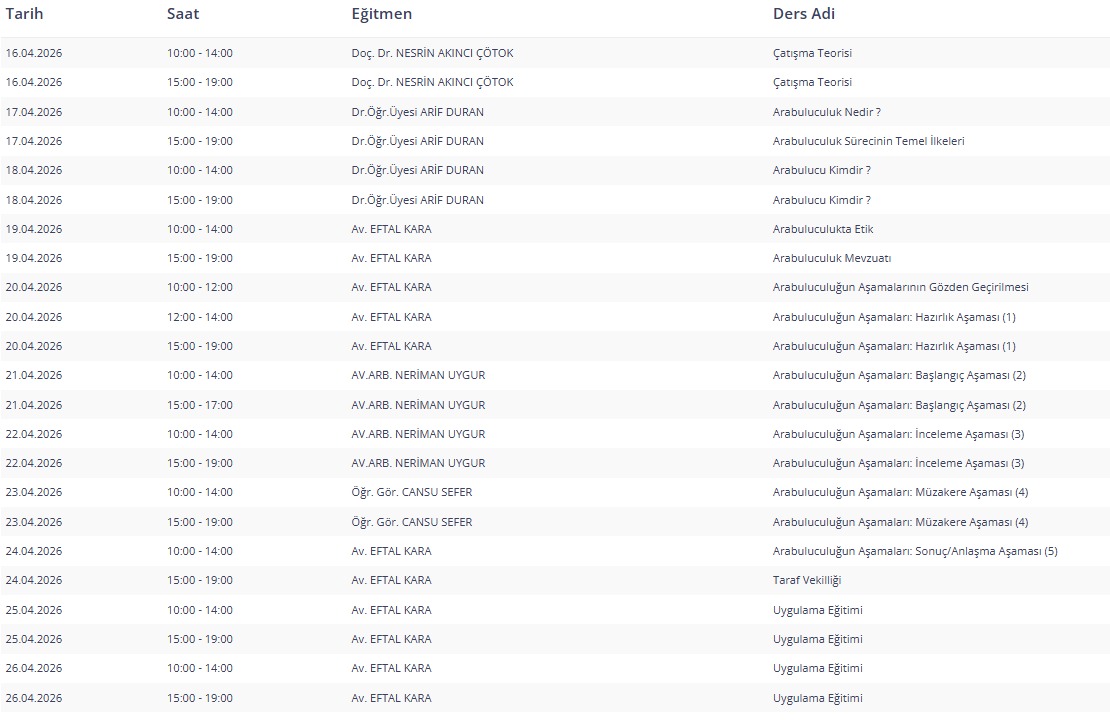 Program; hukuk mezunlarının arabuluculuk mesleğini yürütebilmesi için zorunlu olan teorik bilgilendirme ve uygulamalı eğitim aşamalarını bir araya getirir.