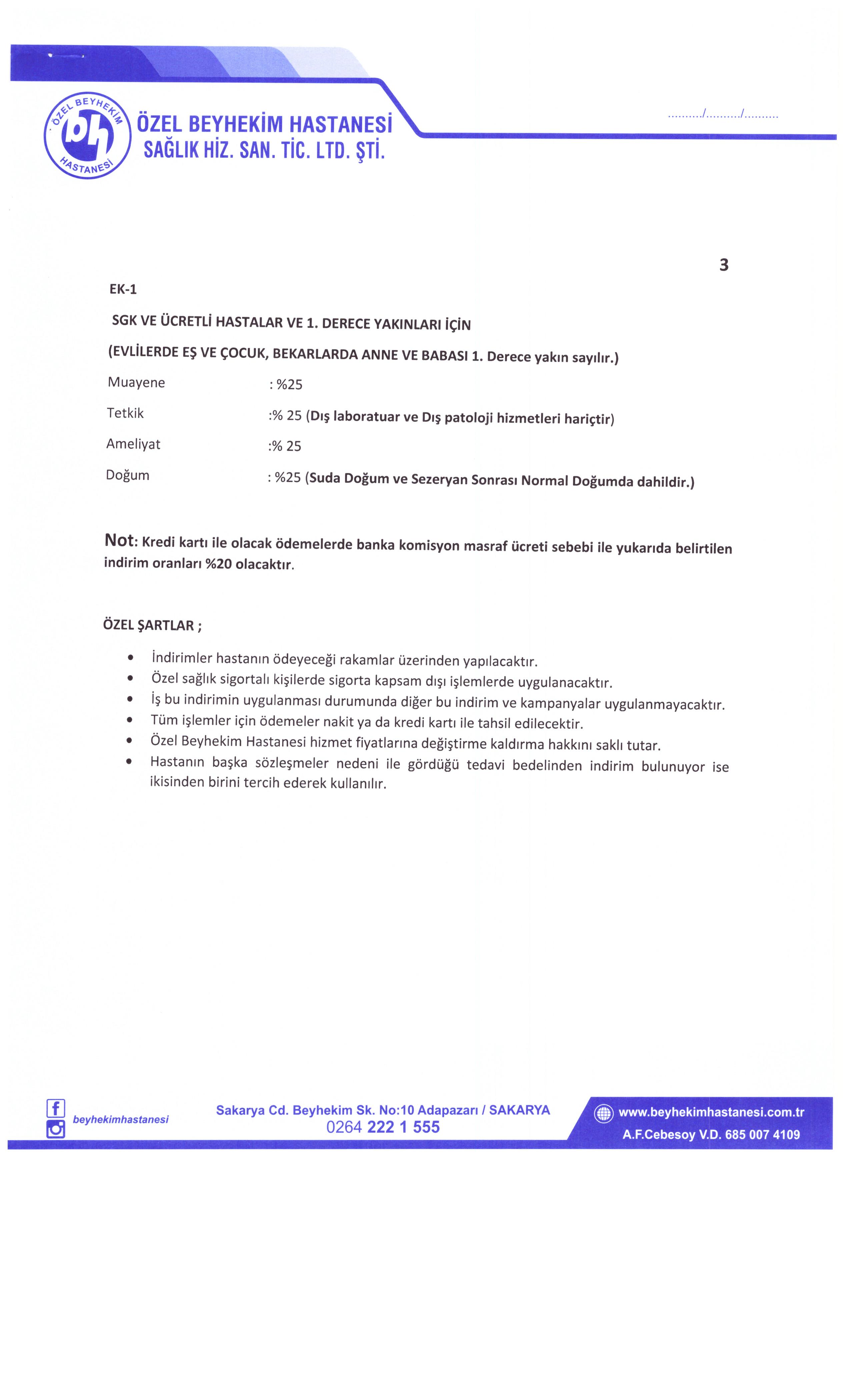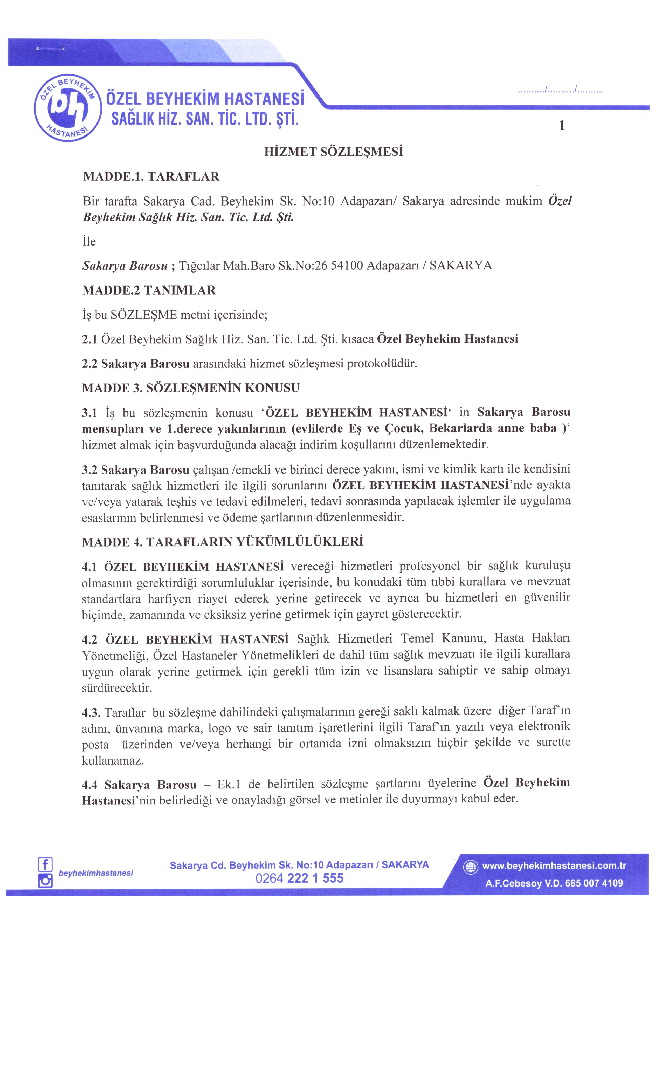 Baromuz ile Sakarya Özel Beyhekim Hastanesi arasında bir protokol imzalandı. Yapılan anlaşmaya göre meslektaşlarımız ve 1. Derece yakınlarına (evlilerde eş ve çocuk, bekarlarda anne baba) %25 indirim imkanı sağlanmıştır. Detaylı bilgi ekte yer alan protokol metninde yayımlanmış olup bilginize sunulur.