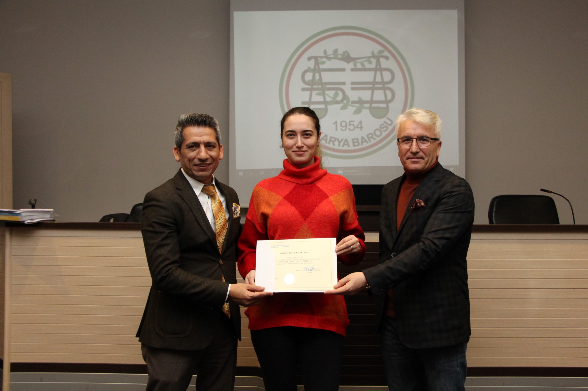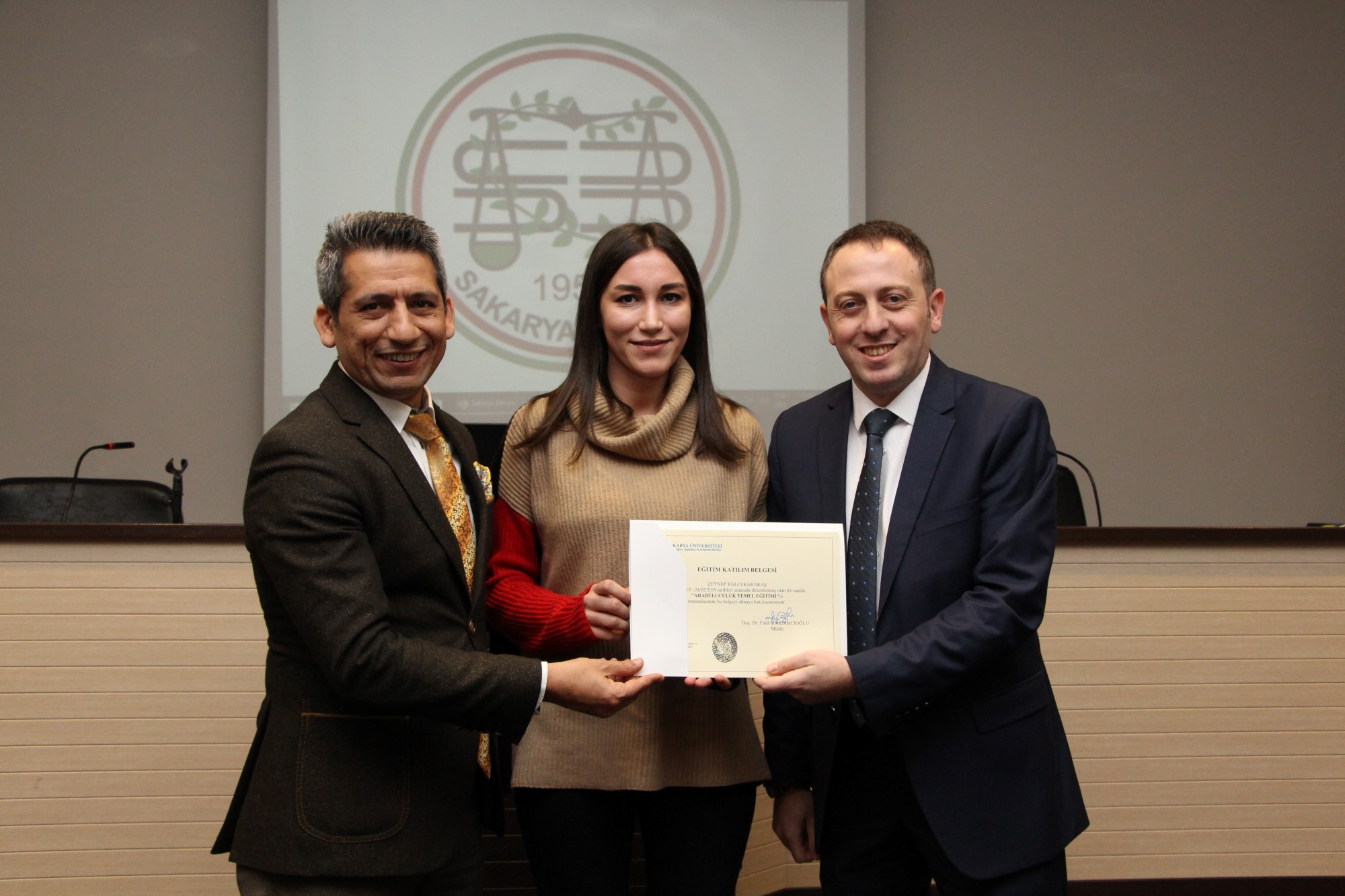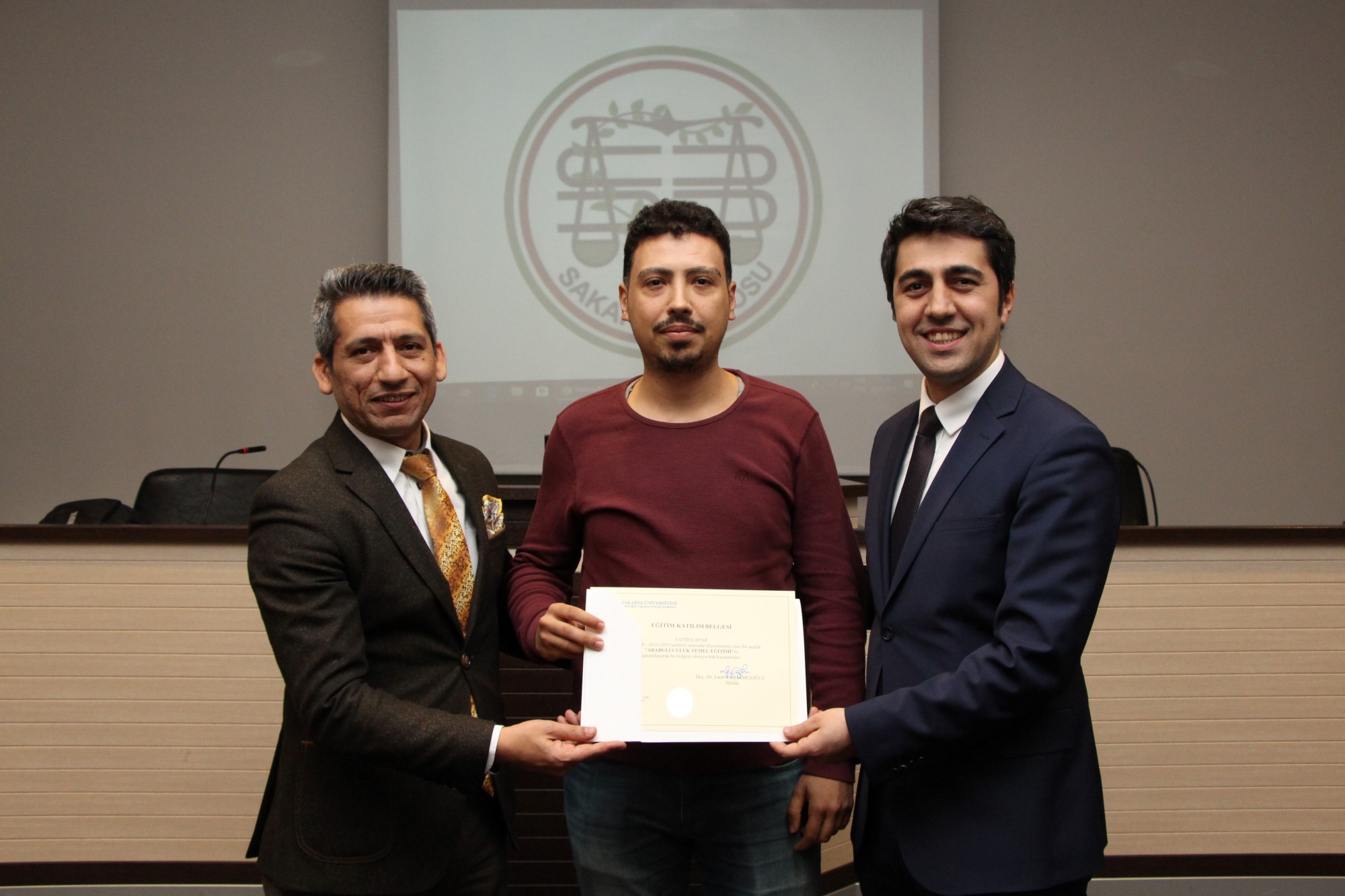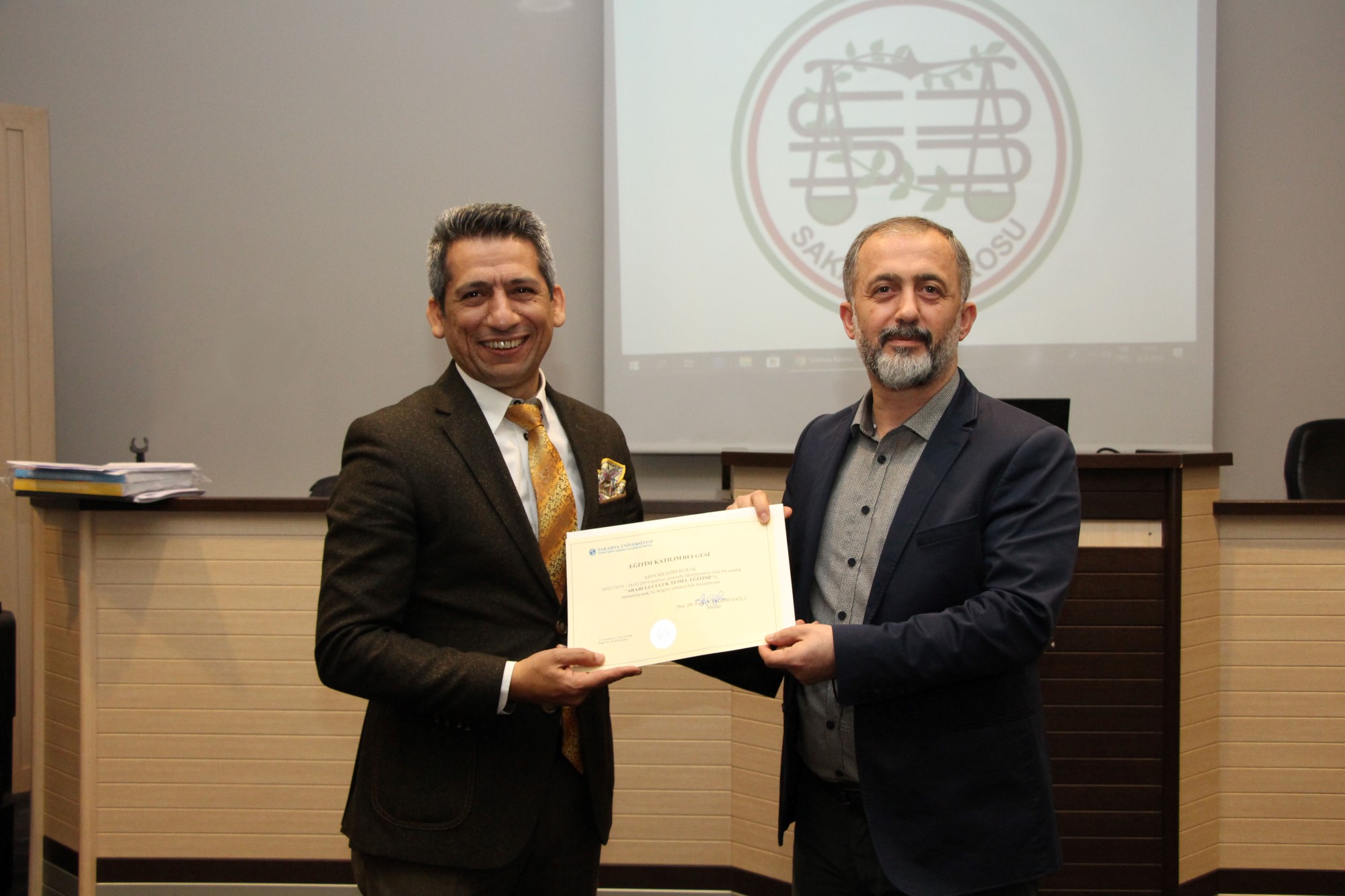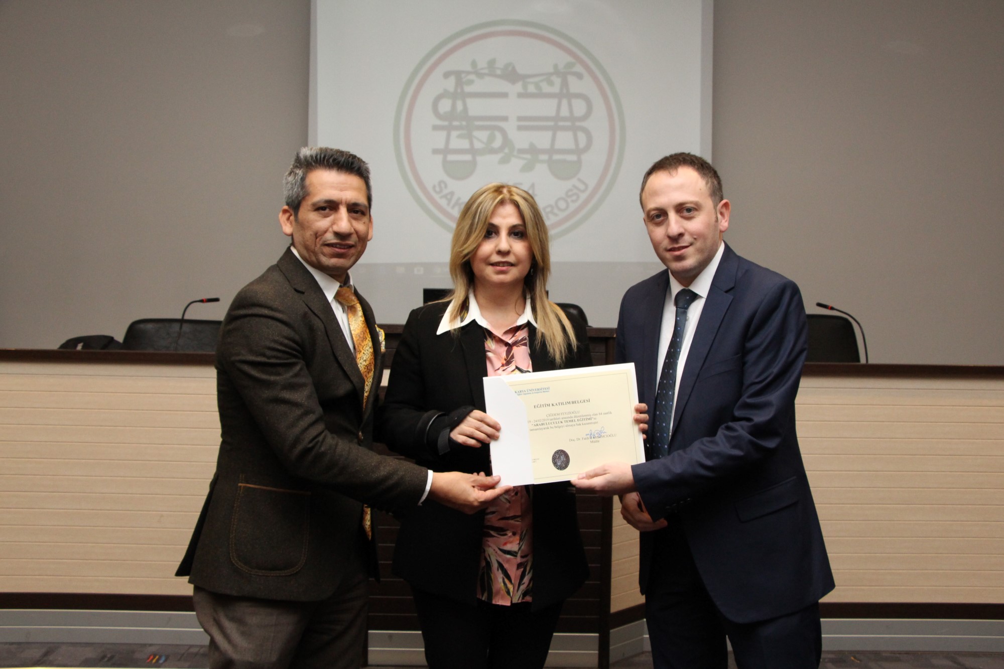 Eğitime Sakarya Barosu Başkanı Av. Abdurrahim Burak da katılırken, Başkan Burak’a Arabuluculuk Sertifikasını Sakarya Üniversitesi Rektörü Prof. Dr. Fatih Savaşan takdim etti.
