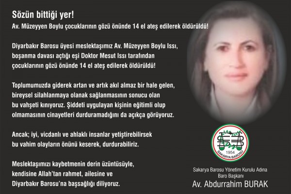 Diyarbakır Barosu üyesi meslektaşımız Av. Müzeyyen Boylu Issı, boşanma davası açtığı eşi Doktor Mesut Issı tarafından çocuklarının gözü önünde 14 el ateş edilerek öldürüldü!