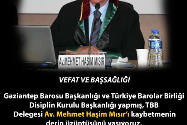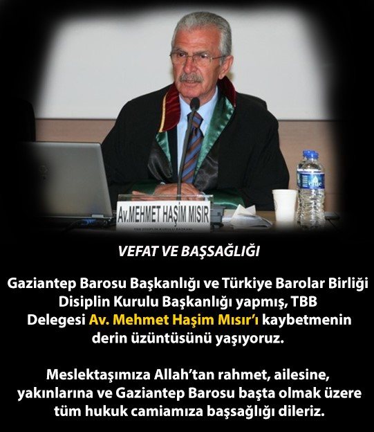 Gaziantep Barosu Başkanlığı ve Türkiye Barolar Birliği (TBB) Disiplin Kurulu Başkanlığı yapmış, TBB Delegesi Av. Mehmet Haşim Mısır'ı kaybetmenin derin üzüntüsünü yaşıyoruz. Meslektaşımıza Allah'tan rahmet, ailesine, yakınlarına ve Gaziantep Barosu başta olmak üzere tüm hukuk camiamıza başsağlığı dileriz.