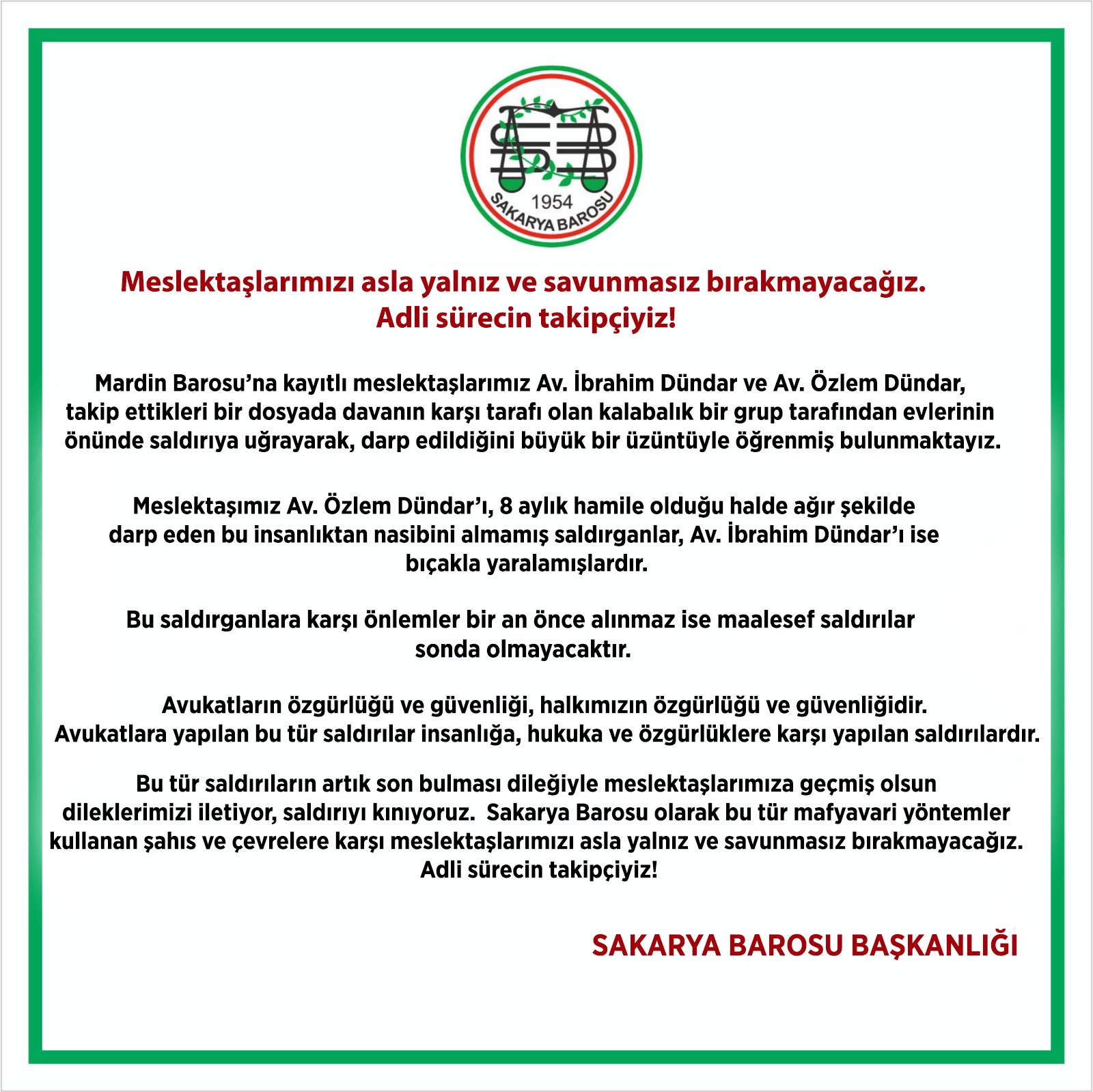 Meslektaşımız Av. Özlem Dündar’ı, 8 aylık hamile olduğu halde ağır şekilde darp eden bu insanlıktan nasibini almamış saldırganlar, Av. İbrahim Dündar’ı ise bıçakla yaralamışlardır.