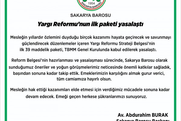 Reform Belgesi’nin hazırlanması ve yasalaşması sürecinde, Sakarya Barosu olarak sunduğumuz öneriler ve yoğun görüşmelerimiz neticesinde önemli katkılar sağladık, süreci başından sonuna kadar takip ettik. Emeklerimizin karşılığını almak gurur verici, tüm camiamıza hayırlı olsun.