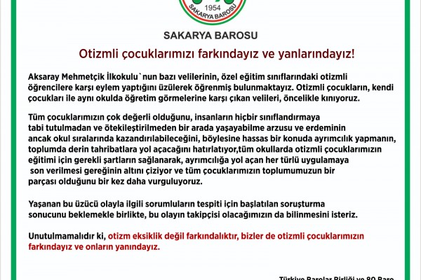 Türkiye Barolar Birliği ve 80 baro, Aksaray Mehmetçik İlkokulu`nun bazı velilerinin, özel eğitim sınıflarındaki otizmli öğrencilere karşı eylem yapmasına ilişkin ortak basın açıklaması yayımladı.