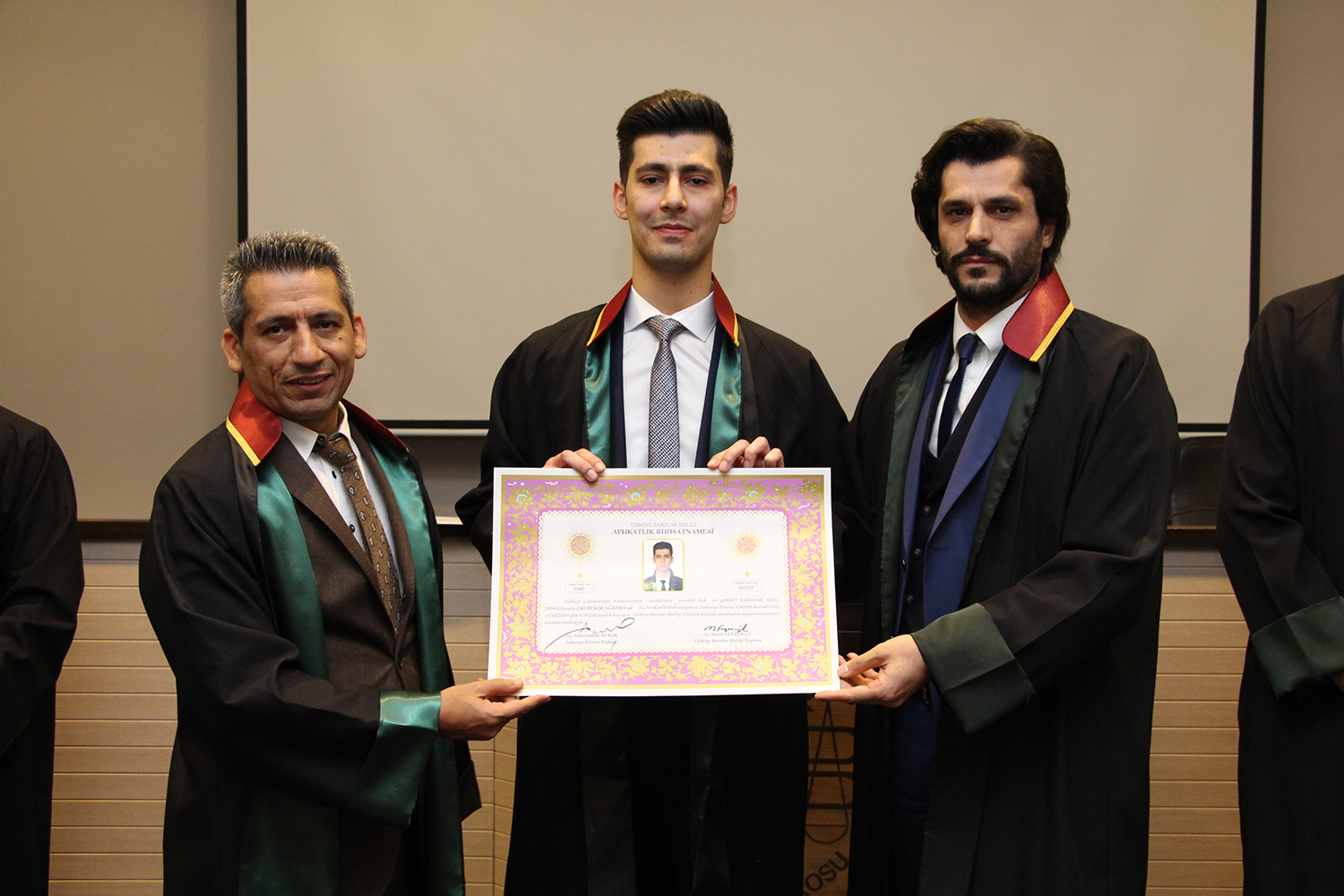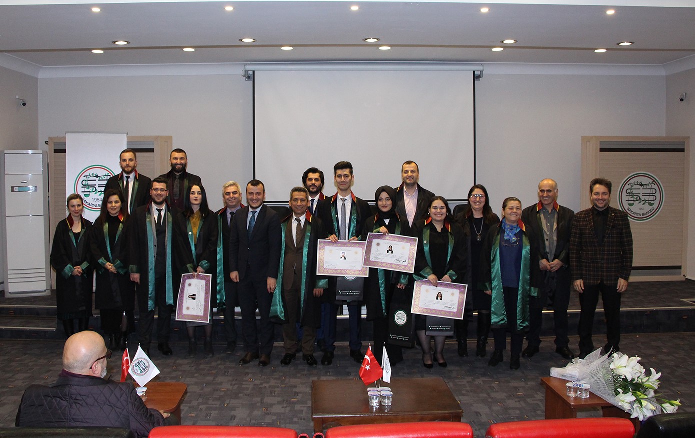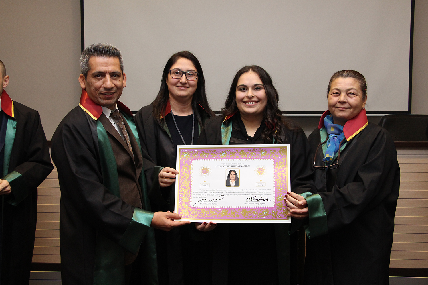 Staj dönemini başarıyla tamamlayan stajyer avukatlar; Merve Akçay, Elanur Berber, Meltem Kabadayı ve Ebubekir Ağbaba, meslek yeminlerinin ardından cübbelerini giyerek ruhsatnamelerini aldı.