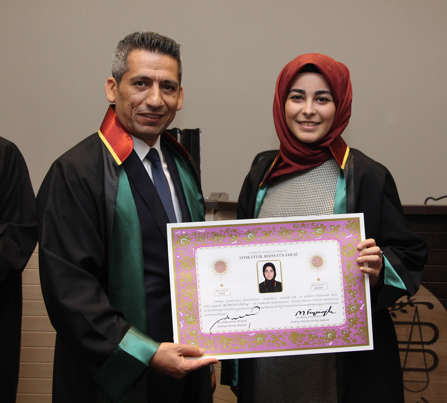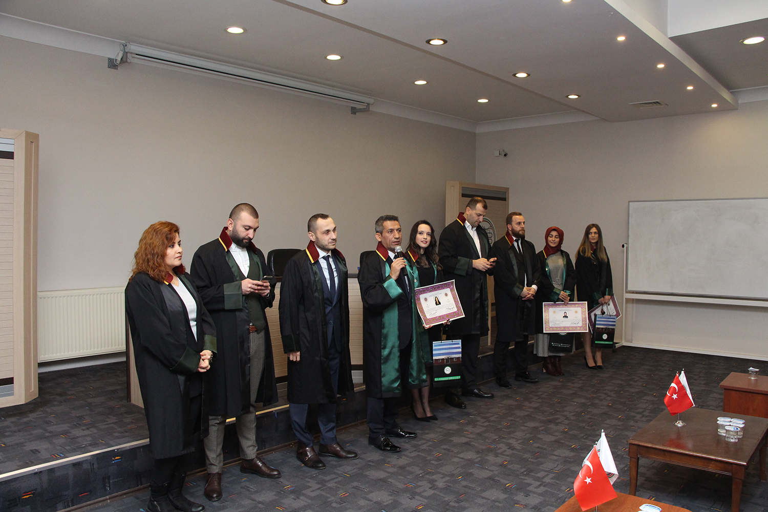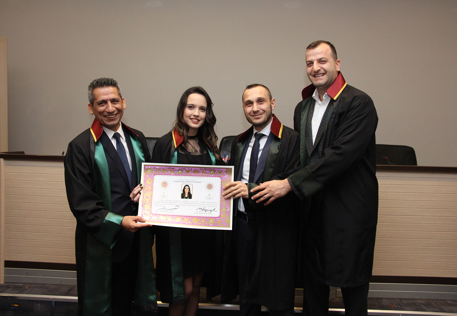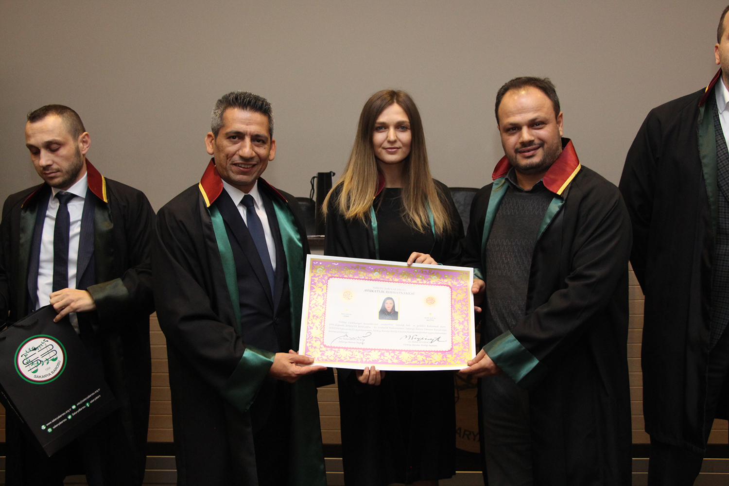 Staj dönemini başarıyla tamamlayan stajyer avukatlar; Rümeysa Öğe, Ayşegül Baylan ve Başak Nur Karayel, meslek yeminlerinin ardından cübbelerini giyerek ruhsatnamelerini aldı.