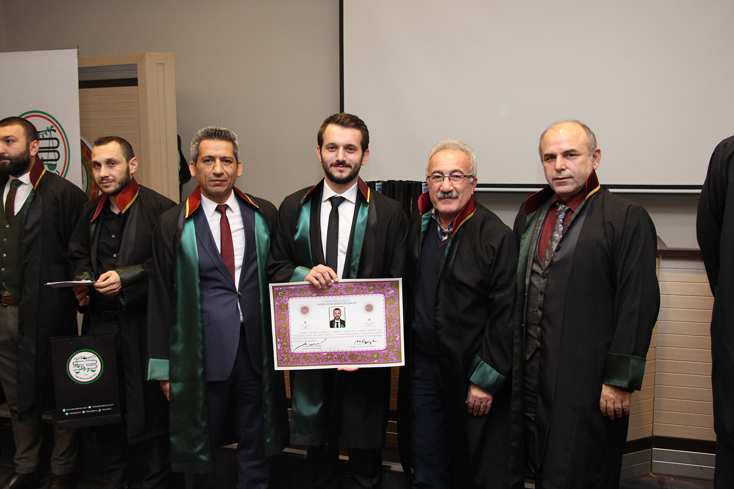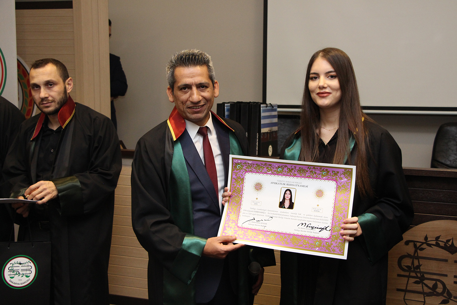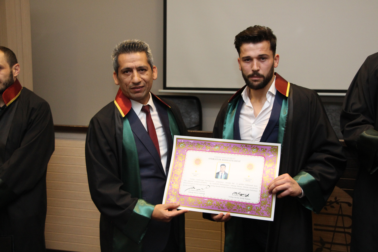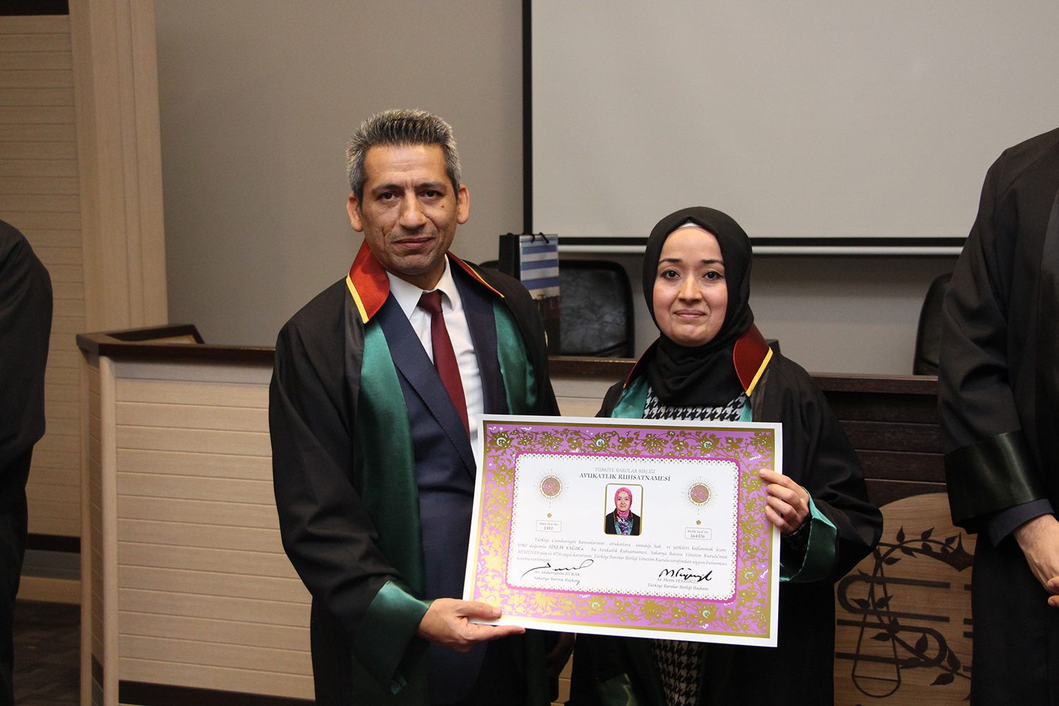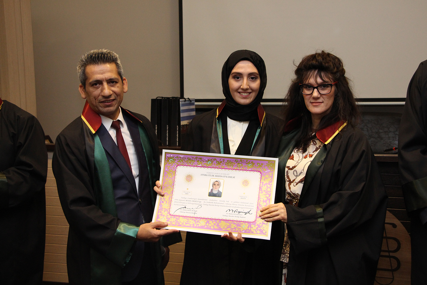 Staj dönemini başarıyla tamamlayan stajyer avukatlar; Serra Koç, Beyza Eroğlu, Nilgün Oyuncakçı, Sinem Yağır, Yunus Güney ve Musa Konuralp Yiğit, meslek yeminlerinin ardından cübbelerini giyerek ruhsatnamelerini aldı.