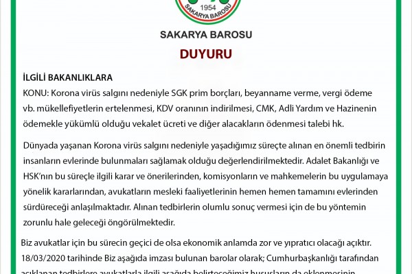 Biz avukatlar için bu sürecin geçici de olsa ekonomik anlamda zor ve yıpratıcı olacağı açıktır. 18/03/2020 tarihinde Biz aşağıda imzası bulunan barolar olarak; Cumhurbaşkanlığı tarafından açıklanan tedbirlere avukatlarla ilgili aşağıda belirteceğimiz hususların da eklenmesinin zorunluluk olduğunu düşünüyoruz: