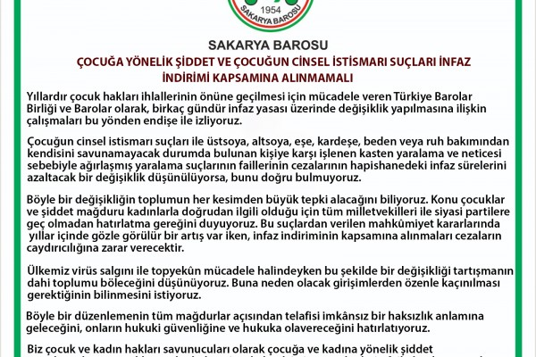 “Yıllardır çocuk hakları ihlallerinin önüne geçilmesi için mücadele veren Türkiye Barolar Birliği ve Barolar olarak, birkaç gündür infaz yasası üzerinde değişiklik yapılmasına ilişkin çalışmaları bu yönden endişe ile izliyoruz.