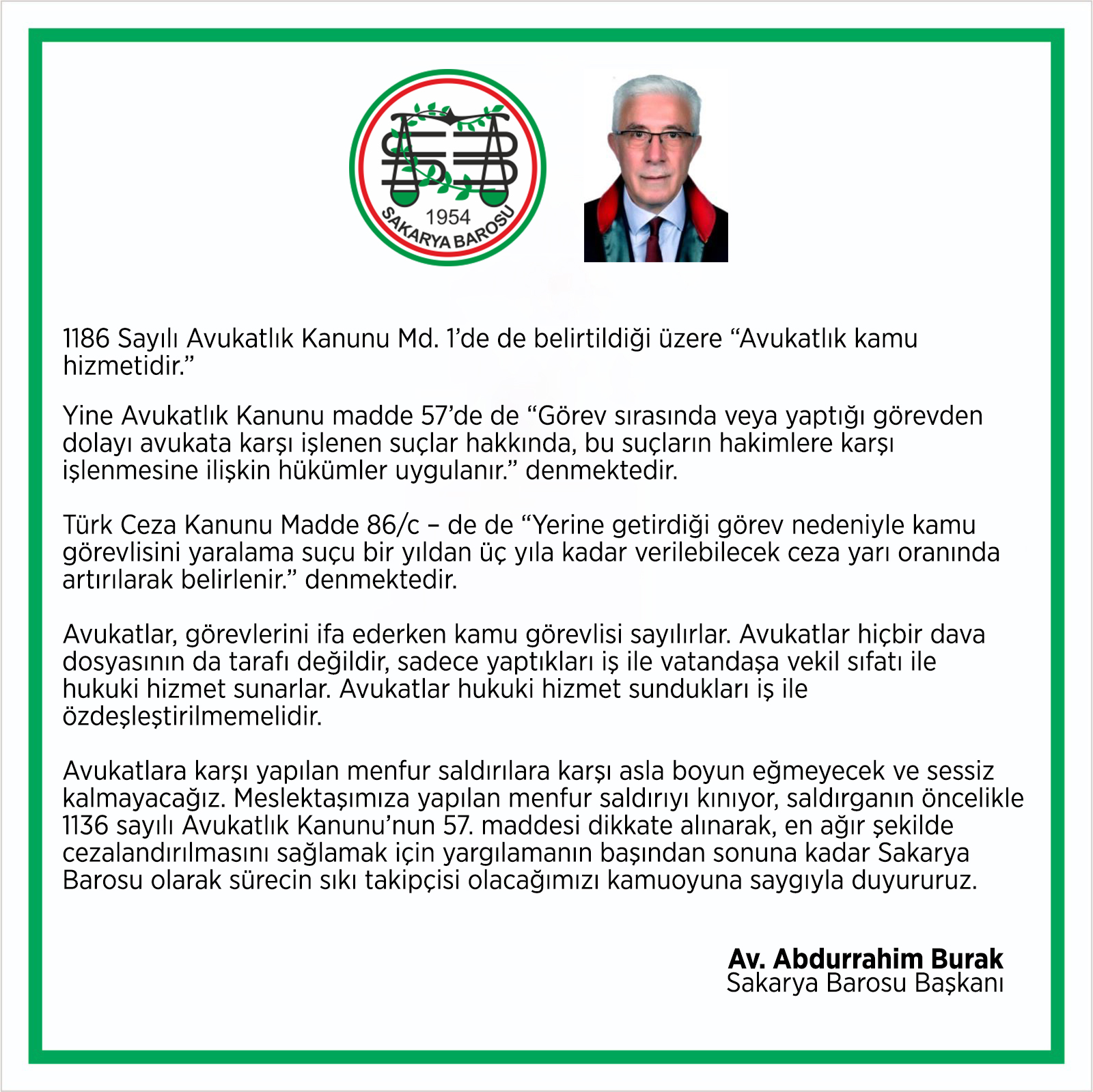 Avukatlara karşı yapılan menfur saldırılara karşı asla boyun eğmeyecek ve sessiz kalmayacağız. Meslektaşımıza yapılan menfur saldırıyı kınıyor, saldırganın öncelikle 1136 sayılı Avukatlık Kanunu’nun 57. maddesi dikkate alınarak, en ağır şekilde cezalandırılmasını sağlamak için yargılamanın başından sonuna kadar Sakarya Barosu olarak sürecin sıkı takipçisi olacağımızı kamuoyuna saygıyla duyururuz.”