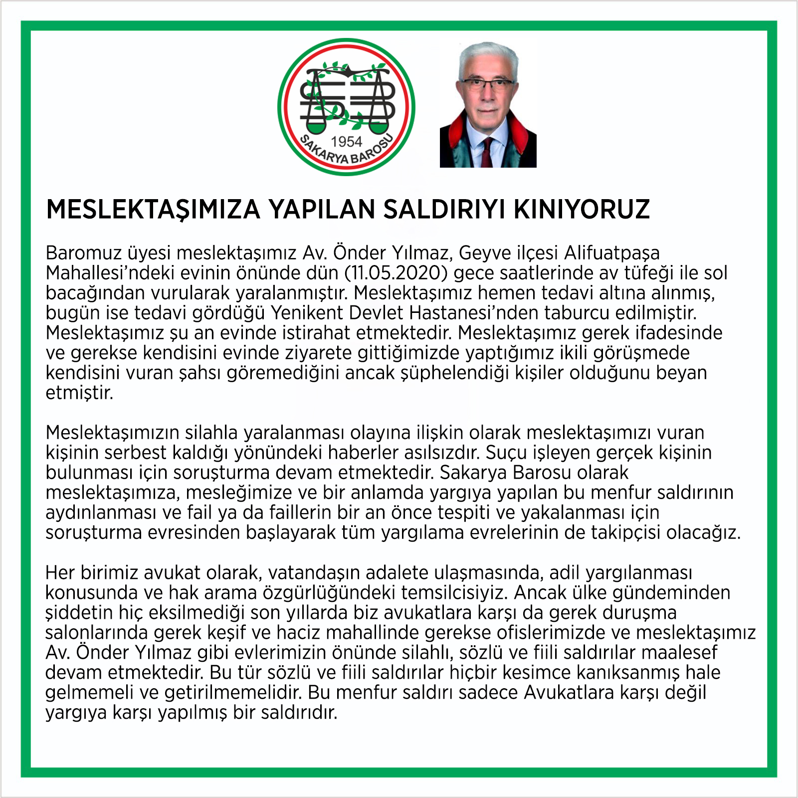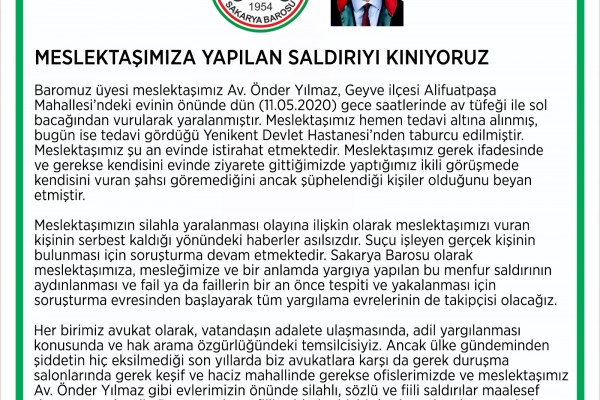 “Baromuz üyesi meslektaşımız Av. Önder Yılmaz, Geyve ilçesi Alifuatpaşa Mahallesi’ndeki evinin önünde dün (11.05.2020) gece saatlerinde av tüfeği ile sol bacağından vurularak yaralanmıştır. Meslektaşımız hemen tedavi altına alınmış, bugün ise tedavi gördüğü Yenikent Devlet Hastanesi’nden taburcu edilmiştir. Meslektaşımız şu an evinde istirahat etmektedir. Meslektaşımız gerek ifadesinde ve gerekse kendisini evinde ziyarete gittiğimizde yaptığımız ikili görüşmede kendisini vuran şahsı göremediğini ancak şüphelendiği kişiler olduğunu beyan etmiştir.