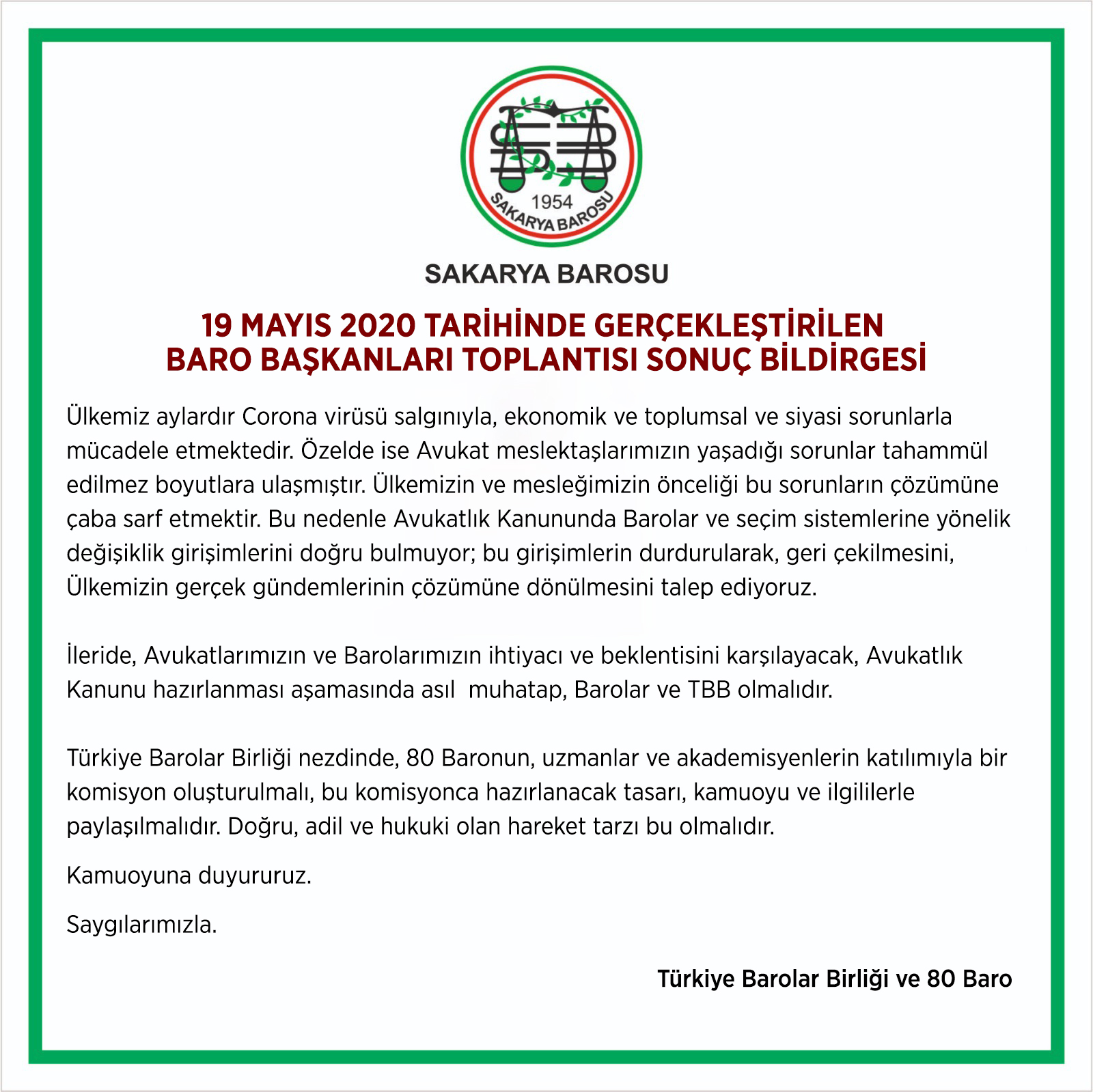 19 Mayıs 2020 tarihinde gerçekleştirilen Baro Başkanları Toplantısı sonuç bildirgesi