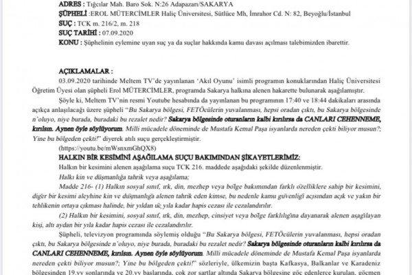 Sakarya Barosu Başkanı Av. Abdurrahim Burak, 3 Eylül 2020 tarihinde bir televizyon programına konuk olan Haliç Üniversitesi Öğretim Üyesi Erol Mütercimler’in Sakarya ve Sakaryalılara ilişkin sözleri nedeniyle suç duyurusunda bulunduklarını açıkladı.