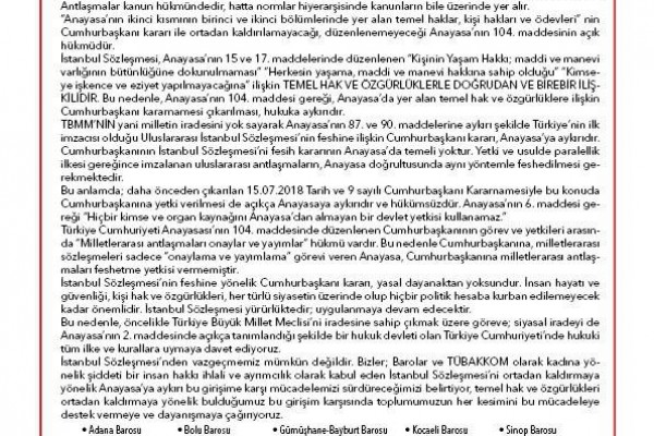 İstanbul Sözleşmesi’nden vazgeçmemiz mümkün değildir. Bizler; Barolar ve TÜBAKKOM olarak kadına yönelik şiddeti bir insan hakkı ihlali ve ayrımcılık olarak kabul eden İstanbul Sözleşmesi’ni ortadan kaldırmaya yönelik Anayasa’ya aykırı bu girişime karşı mücadelemizi sürdüreceğimizi belirtiyor, temel hak ve özgürlükleri ortadan kaldırmaya yönelik bulduğumuz bu girişim karşısında toplumumuzun her kesimini bu mücadeleye destek vermeye ve dayanışmaya çağırıyoruz."