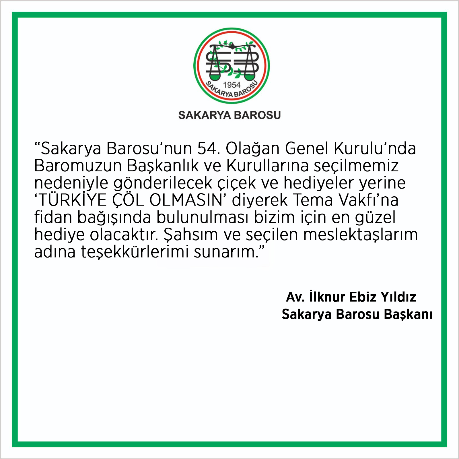 “Sakarya Barosu’nun 54. Olağan Genel Kurulu’nda Baromuzun Başkanlık ve Kurullarına seçilmemiz nedeniyle gönderilecek çiçek ve hediyeler yerine ‘TÜRKİYE ÇÖL OLMASIN’ diyerek Tema Vakfı’na fidan bağışında bulunulması bizim için en güzel hediye olacaktır. Şahsım ve seçilen meslektaşlarım adına teşekkürlerimi sunarım.”