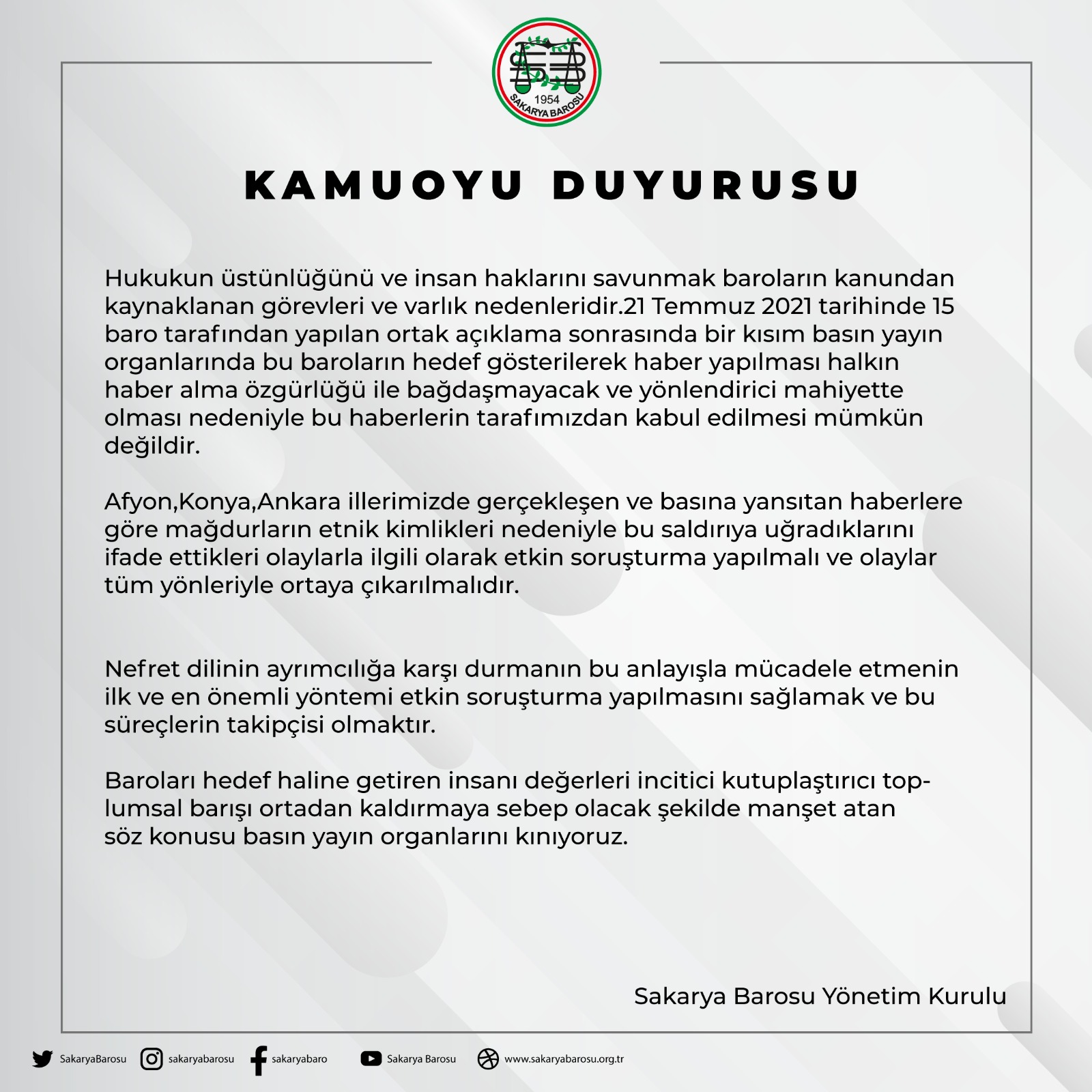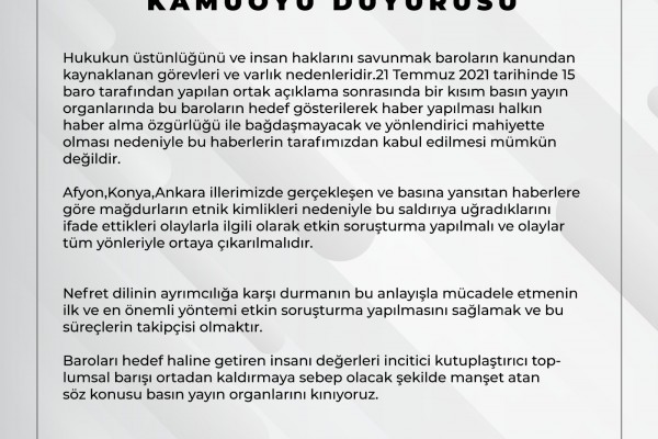 Hukukun üstünlüğünü ve insan haklarını savunmak baroların kanundan kaynaklanan görevleri ve varlık nedenleridir.21 Temmuz 2021 tarihinde 15 baro tarafından yapılan ortak açıklama sonrasında bir kısım basın yayın organlarında bu baroların hedef gösterilerek haber yapılması halkın haber alma özgürlüğü ile bağdaşmayacak ve yönlendirici mahiyette olması nedeniyle bu haberlerin tarafımızdan kabul edilmesi mümkün değildir.