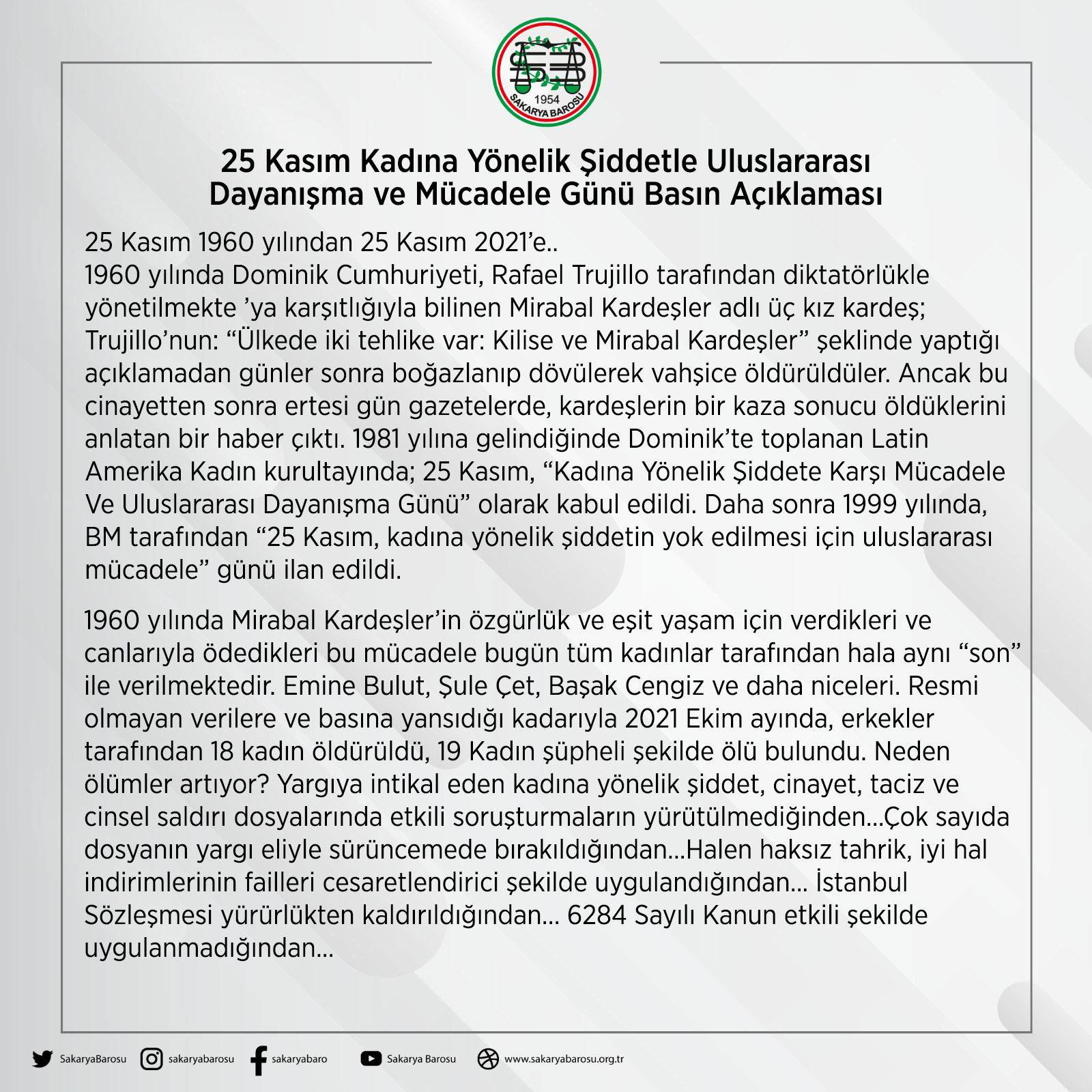 Sakarya Barosu Kadın Hakları Merkezi, 25 Kasım Kadına Yönelik Şiddete Karşı Uluslararası Mücadele Günü nedeniyle basın açıklaması yayımladı.