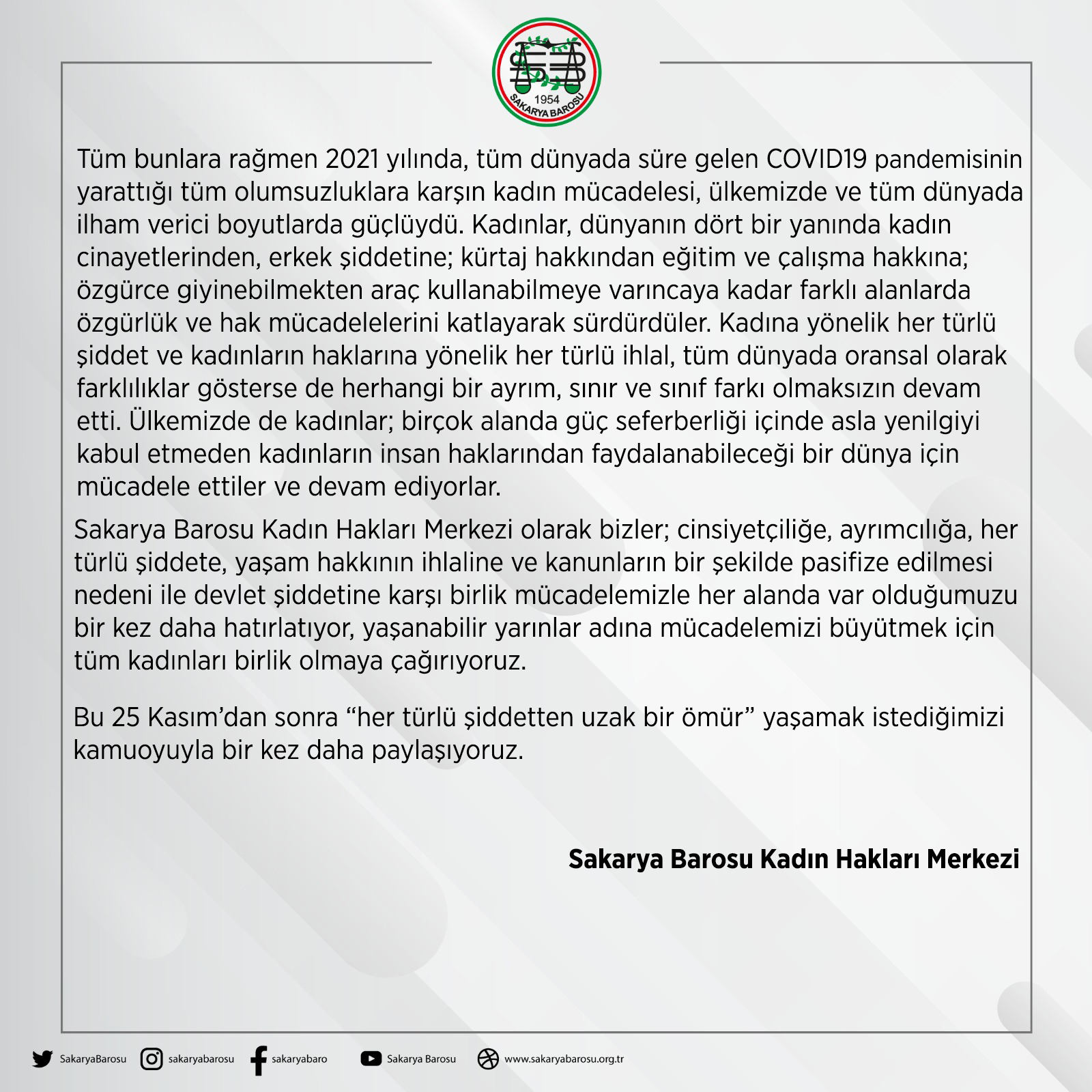 Sakarya Barosu Kadın Hakları Komisyonu olarak bizler; cinsiyetçiliğe, ayrımcılığa, her türlü şiddete, yaşam hakkının ihlaline ve kanunların bir şekilde pasifize edilmesi nedeni ile devlet şiddetine karşı birlik mücadelemizle her alanda var olduğumuzu bir kez daha hatırlatıyor, yaşanabilir yarınlar adına mücadelemizi büyütmek için tüm kadınları birlik olmaya çağırıyoruz.