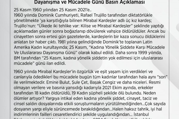 1960 yılında Mirabal Kardeşler’in özgürlük ve eşit yaşam için verdikleri ve canlarıyla ödedikleri bu mücadele bugün tüm kadınlar tarafından hala aynı “son” ile verilmektedir. Emine Bulut, Şule Çet, Başak Cengiz ve daha niceleri. Resmi olmayan verilere göre ve basına yansıdığı kadarıyla 2021 Ekim ayında, erkekler tarafından 18 kadın öldürüldü ve 19 kadın şüpheli şekilde ölü bulundu. Neden ölümler artıyor? Yargıya intikal eden kadına yönelik şiddet, cinayet, taciz ve cinsel saldırı dosyalarında etkili soruşturmalar yürütülmediğinden… Çok sayıda dosya, yargı eliyle sürüncemede bırakıldığından…Halen haksız tahrik, iyi hal indirimleri failleri cesaretlendirici şekilde uygulandığından… İstanbul Sözleşmesi yürürlükten kaldırıldığından… 6284 Sayılı Kanun etkili şekilde uygulanmadığından…