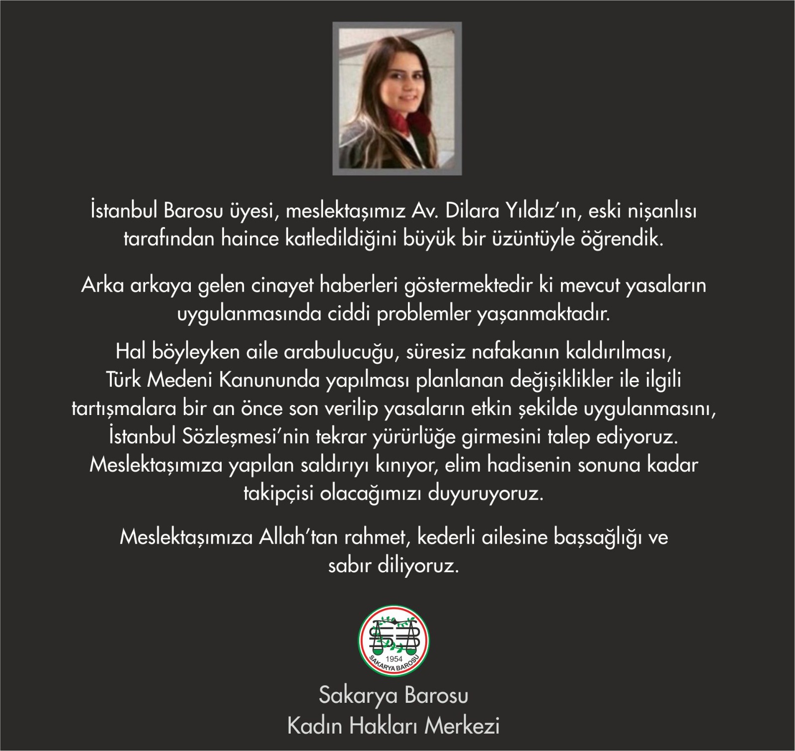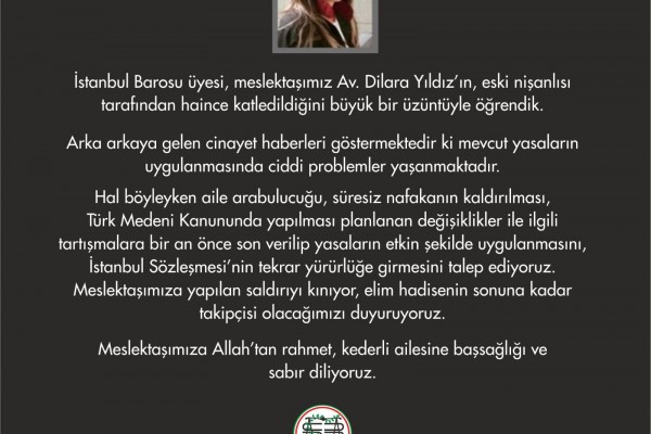 İstanbul Barosu üyesi, meslektaşımız Av. Dilara Yıldız’ın, eski nişanlısı tarafından haince katledildiğini büyük bir üzüntüyle öğrendik.