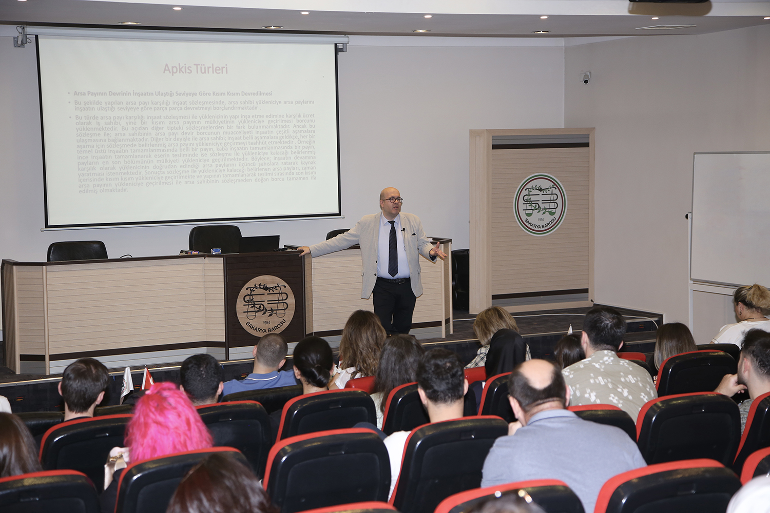 Sakarya Barosu ve Türkiye Barolar Birliği iş birliğiyle ‘Arsa Payı Karşılığı İnşaat Sözleşmesi’ konulu meslek içi eğitim semineri düzenlendi.