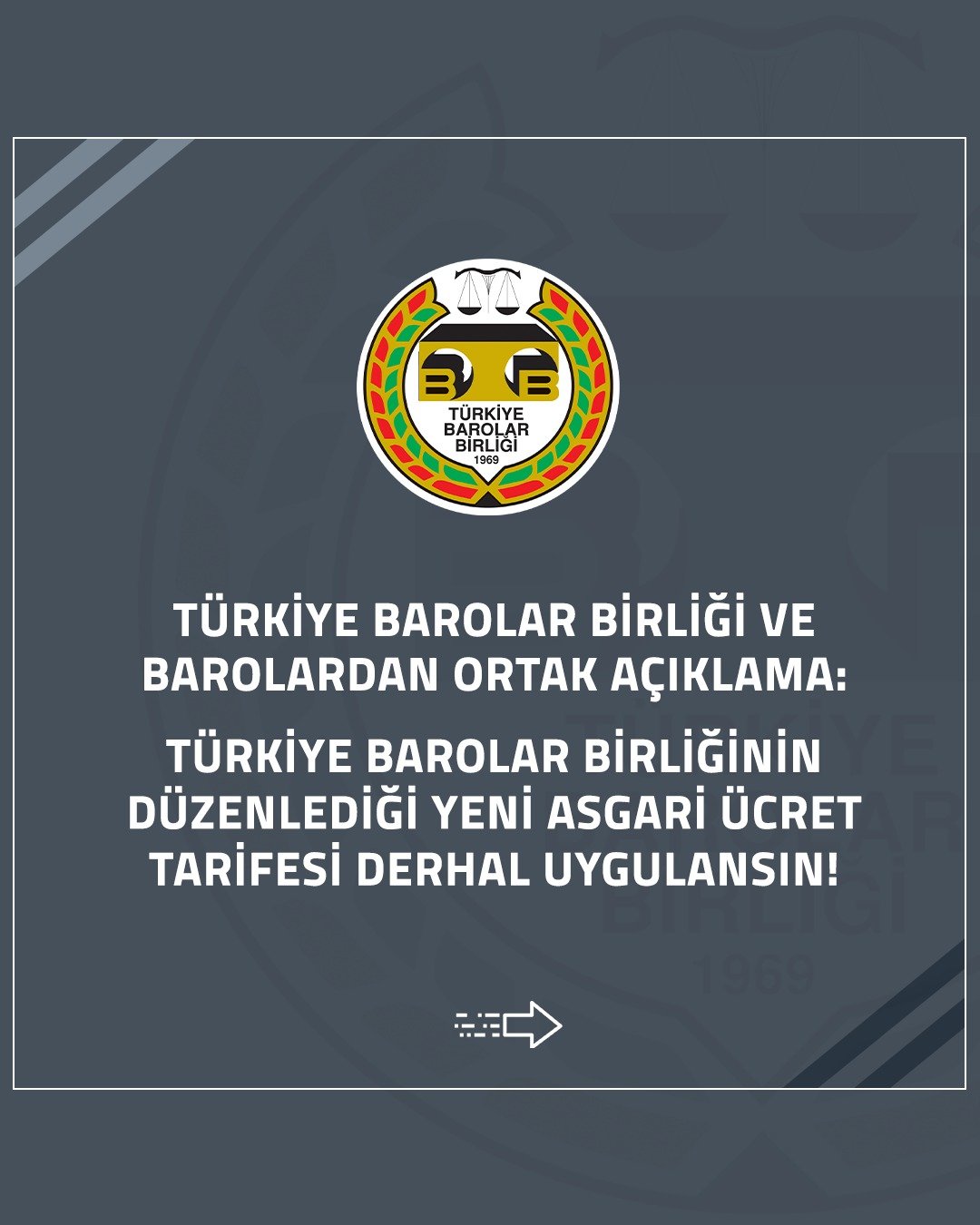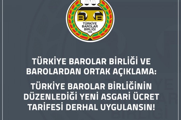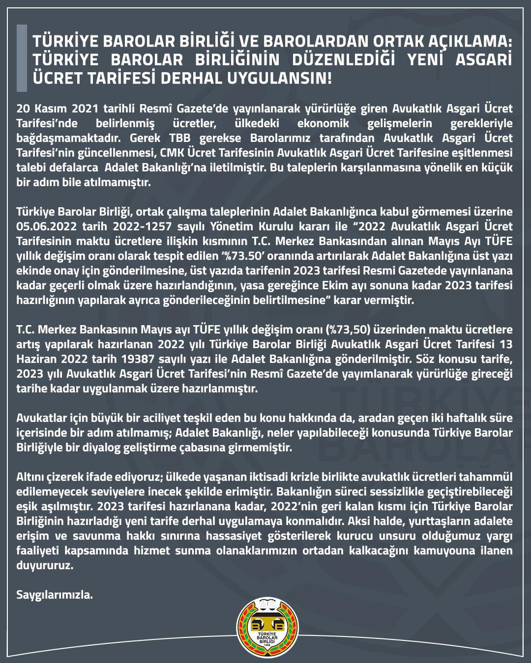 “20 Kasım 2021 tarihli Resmî Gazete’de yayınlanarak yürürlüğe giren Avukatlık Asgari Ücret Tarifesi’nde belirlenmiş ücretler, ülkedeki ekonomik gelişmelerin gerekleriyle bağdaşmamaktadır. Gerek TBB gerekse Barolarımız tarafından Avukatlık Asgari Ücret Tarifesi’nin güncellenmesi, CMK Ücret Tarifesinin Avukatlık Asgari Ücret Tarifesine eşitlenmesi talebi defalarca Adalet Bakanlığı’na iletilmiştir. Bu taleplerin karşılanmasına yönelik en küçük bir adım bile atılmamıştır.