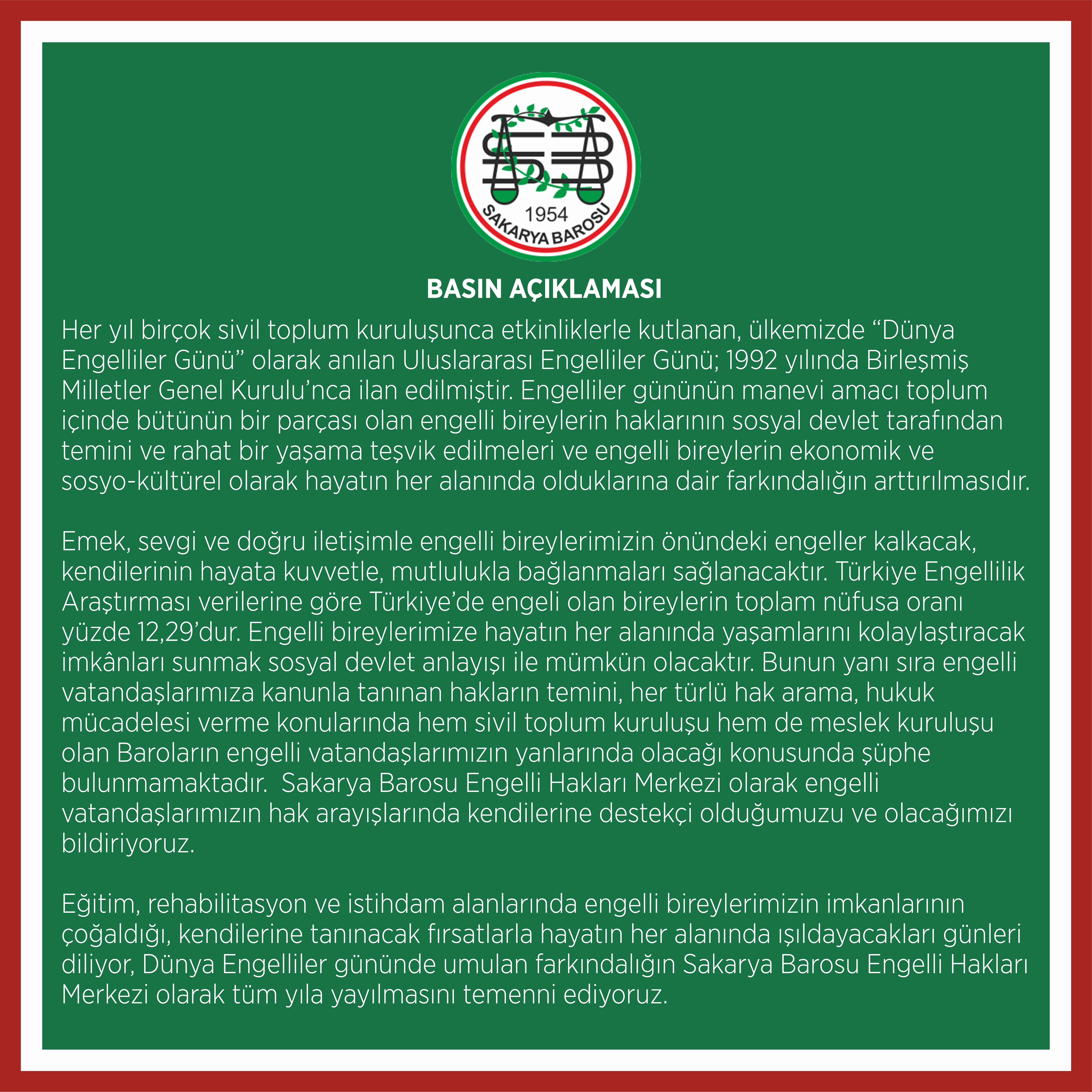 Emek, sevgi ve doğru iletişimle engelli bireylerimizin önündeki engeller kalkacak, kendilerinin hayata kuvvetle, mutlulukla bağlanmaları sağlanacaktır. Türkiye Engellilik Araştırması verilerine göre Türkiye’de engeli olan bireylerin toplam nüfusa oranı yüzde 12,29’dur. Engelli bireylerimize hayatın her alanında yaşamlarını kolaylaştıracak imkânları sunmak sosyal devlet anlayışı ile mümkün olacaktır. Bunun yanı sıra engelli vatandaşlarımıza kanunla tanınan hakların temini, her türlü hak arama, hukuk mücadelesi verme konularında hem sivil toplum kuruluşu hem de meslek kuruluşu olan Baroların engelli vatandaşlarımızın yanlarında olacağı konusunda şüphe bulunmamaktadır. Sakarya Barosu Engelli Hakları Merkezi olarak engelli vatandaşlarımızın hak arayışlarında kendilerine destekçi olduğumuzu ve olacağımızı bildiriyoruz.