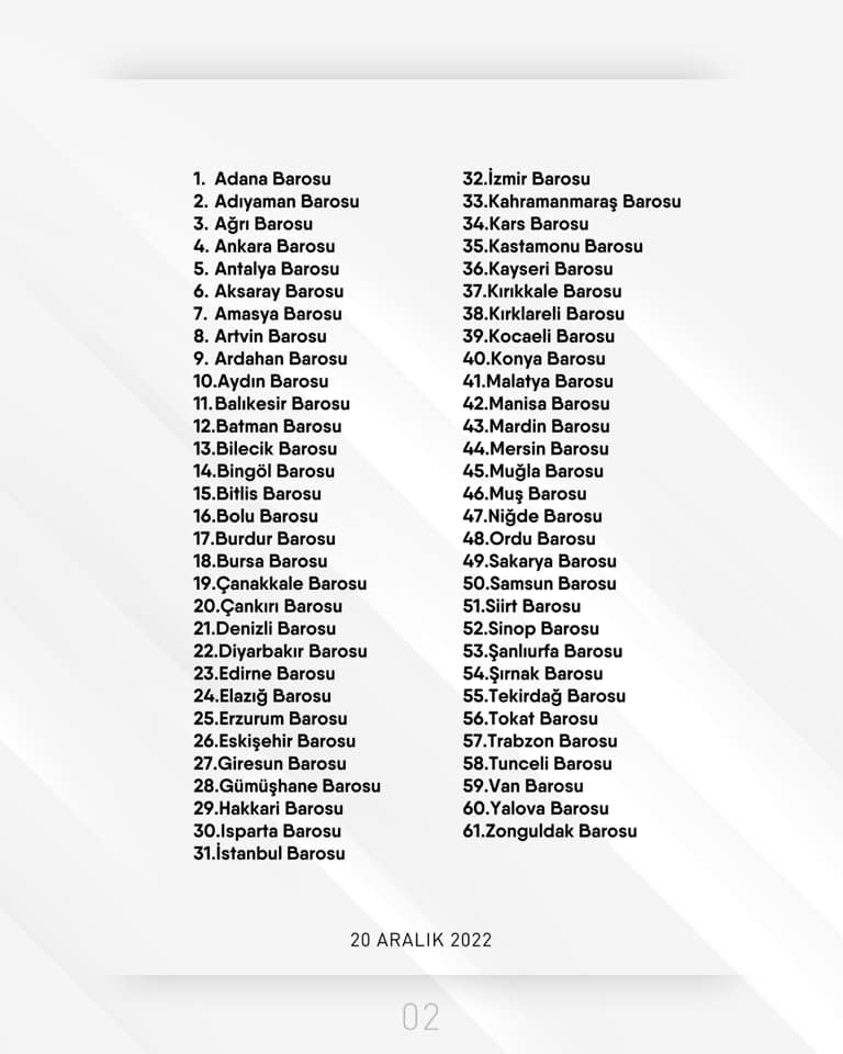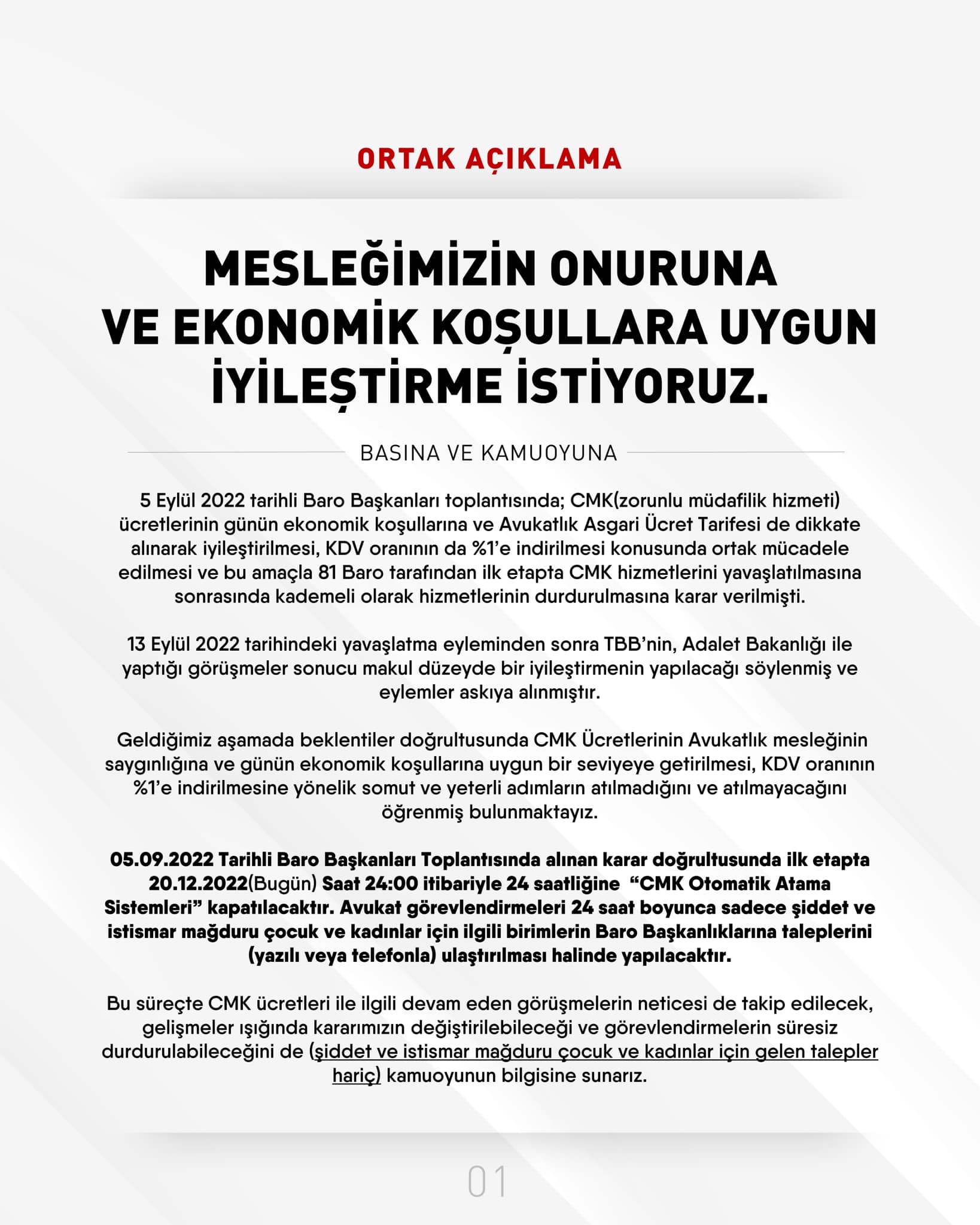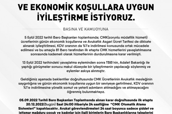 “5 Eylül 2022 tarihli Baro Başkanları toplantısında; CMK(zorunlu müdafilik hizmeti ) ücretlerinin günün ekonomik koşullarına ve Avukatlık Asgari Ücret Tarifesi de dikkate alınarak iyileştirilmesi, KDV oranının da %1’e indirilmesi konusunda ortak mücadele edilmesi ve bu amaçla 81 Baronun ilk etapta CMK hizmetlerini yavaşlatılmasına sonrasında kademeli olarak hizmetin durdurulmasına karar verilmişti.