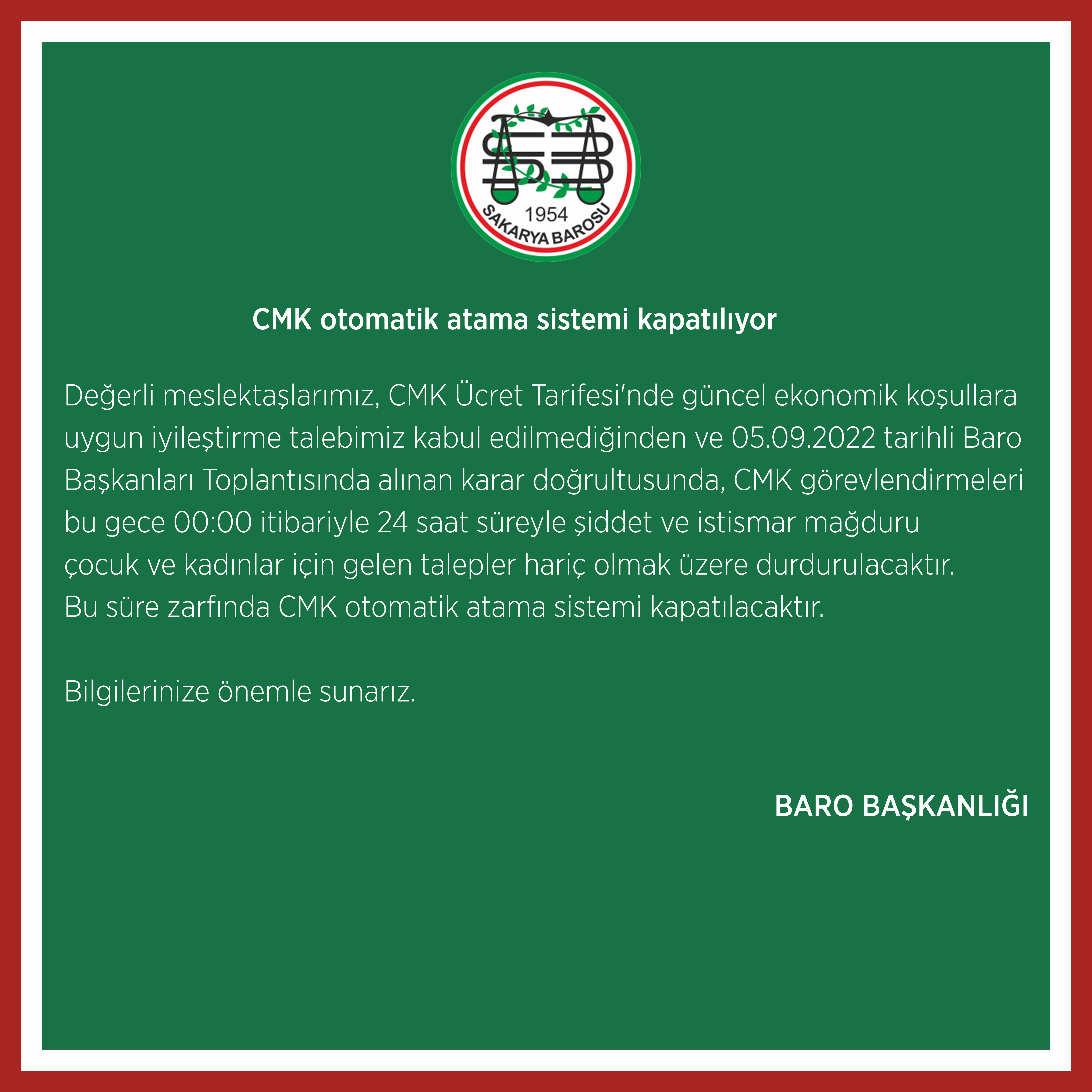 Sakarya Barosu’nun da aralarında olduğu 61 Baro, CMK ücret tarifesinin, Avukatlık Ücret Tarifesi dikkate alınarak iyileştirilmesi ve KDV oranının %1’e indirilmesini istedi. Ayrıca Barolar, 20.12.2022 00:00 itibariyle 24 saatliğine “CMK Otomatik Atama Sistemleri”nin kapatılacağını belirtti.