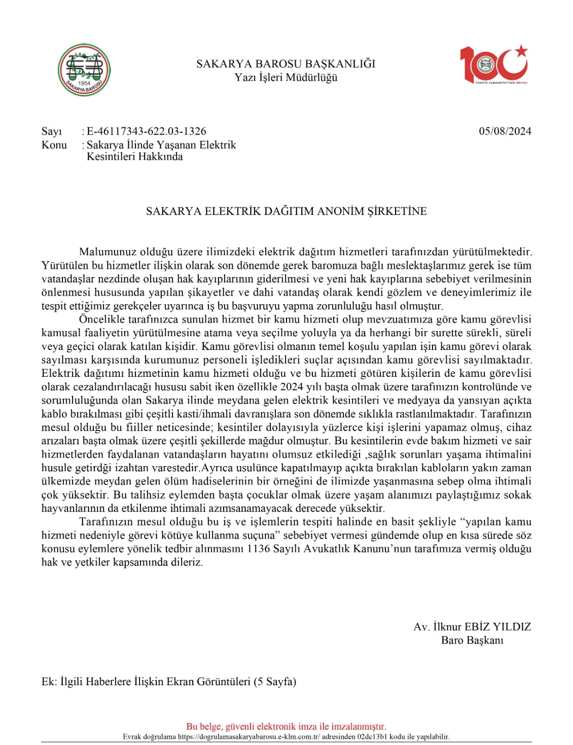 Sakarya Barosu, SEDAŞ’a yazdığı yazı ile, “En kısa sürede söz konusu eylemlere yönelik tedbir alınmasını 1136 Sayılı Avukatlık Kanunu’nun tarafımıza vermiş olduğu hak ve yetkiler kapsamında dileriz” dedi.