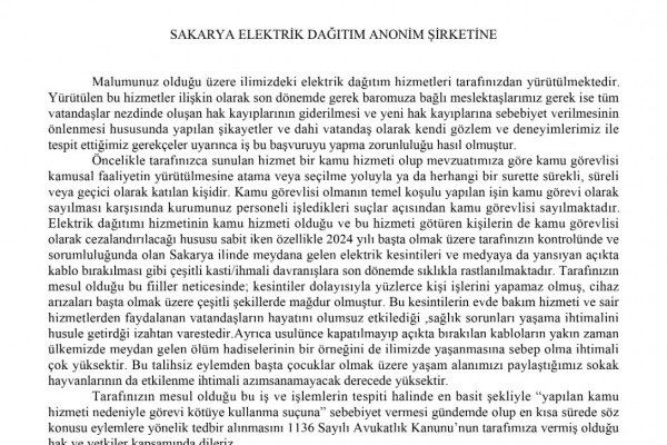 Öncelikle tarafınızca sunulan hizmet bir kamu hizmeti olup mevzuatımıza göre kamu görevlisi kamusal faaliyetin yürütülmesine atama veya seçilme yoluyla ya da herhangi bir surette sürekli, süreli veya geçici olarak katılan kişidir. Kamu görevlisi olmanın temel koşulu yapılan işin kamu görevi olarak sayılması karşısında kurumunuz personeli işledikleri suçlar açısından kamu görevlisi sayılmaktadır. Elektrik dağıtımı hizmetinin kamu hizmeti olduğu ve bu hizmeti götüren kişilerin de kamu görevlisi olarak cezalandırılacağı hususu sabit iken özellikle 2024 yılı başta olmak üzere tarafınızın kontrolünde ve sorumluluğunda olan Sakarya ilinde meydana gelen elektrik kesintileri ve medyaya da yansıyan açıkta kablo bırakılması gibi çeşitli kasti/ihmali davranışlara son dönemde sıklıkla rastlanılmaktadır. Tarafınızın mesul olduğu bu fiiller neticesinde; kesintiler dolayısıyla yüzlerce kişi işlerini yapamaz olmuş, cihaz arızaları başta olmak üzere çeşitli şekillerde mağdur olmuştur. Bu kesintilerin evde bakım hizmeti ve sair hizmetlerden faydalanan vatandaşların hayatını olumsuz etkilediği, sağlık sorunları yaşama ihtimalini husule getirdiği izahtan varestedir. Ayrıca usulünce kapatılmayıp açıkta bırakılan kabloların yakın zaman ülkemizde meydan gelen ölüm hadiselerinin bir örneğini de ilimizde yaşanmasına sebep olma ihtimali çok yüksektir. Bu talihsiz eylemden başta çocuklar olmak üzere yaşam alanımızı paylaştığımız sokak hayvanlarının da etkilenme ihtimali azımsanamayacak derecede yüksektir.