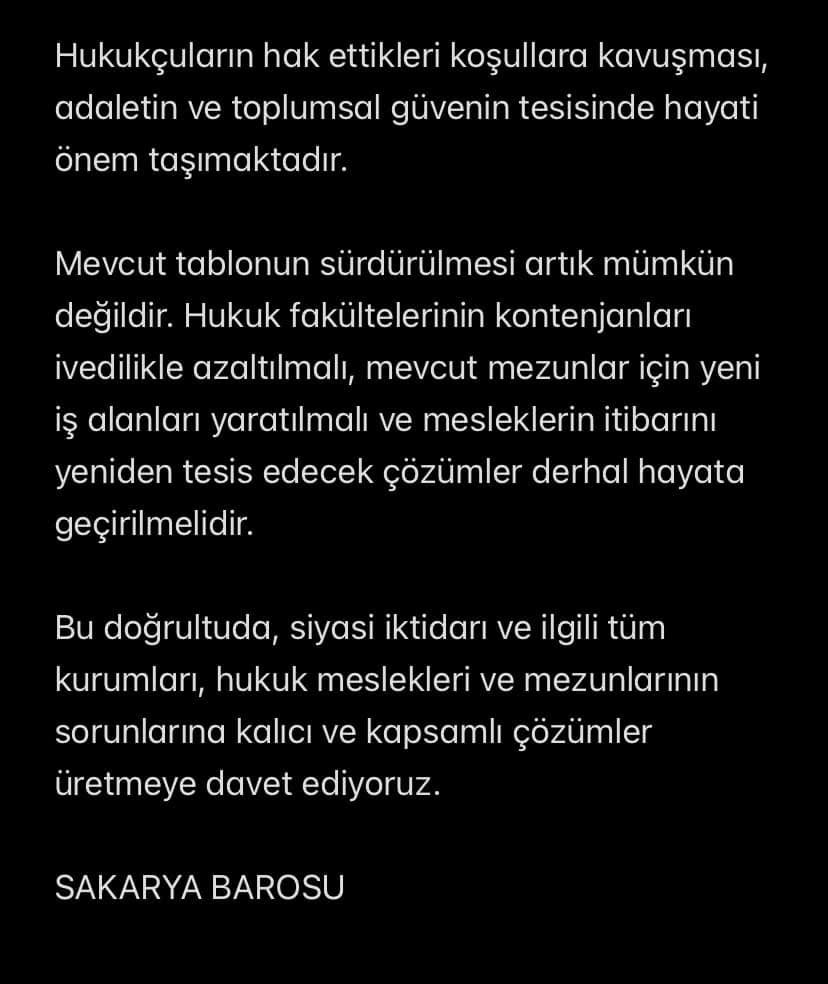Mevcut tablonun sürdürülmesi artık mümkün değildir. Hukuk fakültelerinin kontenjanları ivedilikle azaltılmalı, mevcut mezunlar için yeni iş alanları yaratılmalı ve mesleklerin itibarını yeniden tesis edecek çözümler derhal hayata geçirilmelidir.