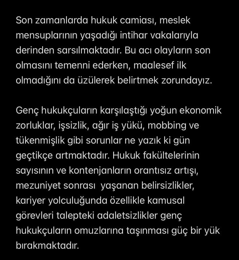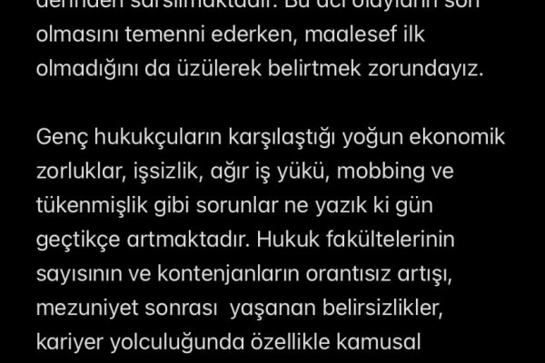 Son zamanlarda hukuk camiası, meslek mensuplarının yaşadığı intihar vakalarıyla derinden sarsılmaktadır. Bu acı olayların son olmasını temenni ederken, maalesef ilk olmadığını da üzülerek belirtmek zorundayız.