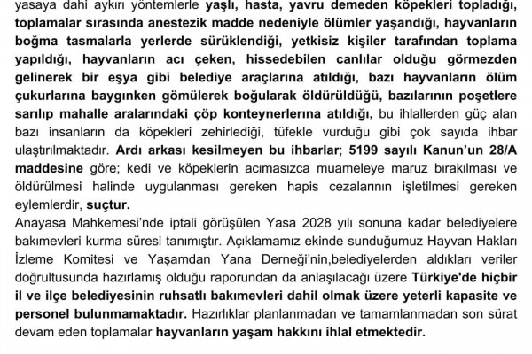 "Türkiye'nin her yerinden Baromuz Hayvan Hakları Merkezi’ne belediyelerin mevcut yasaya dahi aykırı yöntemlerle yaşlı, hasta, yavru demeden köpekleri topladığı, toplamalar sırasında anestezik madde nedeniyle ölümler yaşandığı, hayvanların boğma tasmalarla yerlerde sürüklendiği, yetkisiz kişiler tarafından toplama yapıldığı, hayvanların acı çeken, hissedebilen canlılar olduğu görmezden gelinerek bir eşya gibi belediye araçlarına atıldığı, bazı hayvanların ölüm çukurlarına baygınken gömülerek boğularak öldürüldüğü, bazılarının poşetlere sarılıp mahalle aralarındaki çöp konteynerlerına atıldığı, bu ihlallerden güç alan bazı insanların da köpekleri zehirlediği, tüfekle vurduğu gibi çok sayıda ihbar ulaştırılmaktadır. Ardı arkası kesilmeyen bu ihbarlar; 5199 sayılı Kanun’un 28/A maddesine göre; kedi ve köpeklerin acımasızca muameleye maruz bırakılması ve öldürülmesi halinde uygulanması gereken hapis cezalarının işletilmesi gereken eylemlerdir, suçtur.